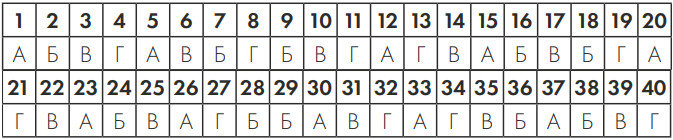 Обведите кружком букву, соответствующую каждой поставленной вами галочке. Затем подсчитайте общее количество А, Б, В и Г и посмотрите профиль на следующих страницах.