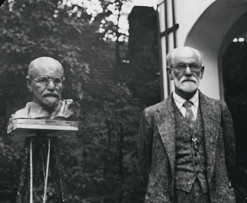 Чаще всего мы представляем себе Фрейда сдержанным, строгим и даже как будто торжественным – как на всем известной фотографии с сигарой или на той, где он запечатлен в своем саду в Вене рядом с собственным бюстом, над которым работал в 1930 году скульптор Оскар Нимон. Но Фрейд бывал и другим. Мари Бонапарт, его пациентка и последовательница, снимает основателя психоанализа в рабочем кабинете, пытаясь передать очарование его личности и его теории. Мы видим их отражения в зеркале. Фрейд не смотрит на зрителя, выражения лица не угадать, плечи приподняты, он выглядит напряженным. Но позировать ему приходилось уже не раз, в чем же причина? Это – снимок на память: идет 1938 год, Фрейду вскоре предстоит расстаться и с Веной, и со своим домом, и с любовно собранной коллекцией статуэток. Нацисты уже заняли Австрию, и Мари Бонапарт не без труда удается получить для Фрейда разрешение на выезд.