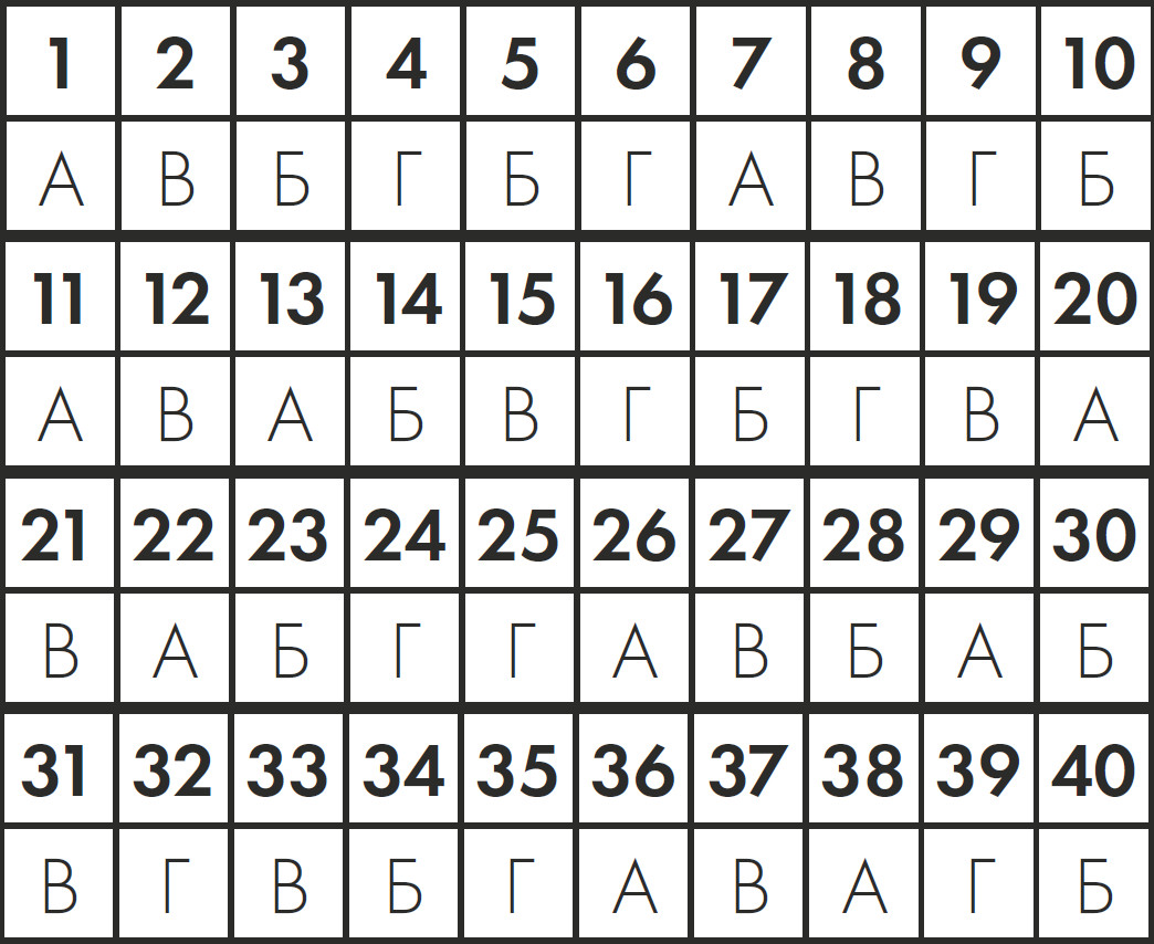 Обведите кружком букву, соответствующую каждой поставленной вами галочке. Затем подсчитайте общее количество А, Б, В и Г и посмотрите, какую роль секс играет в вашей жизни, на следующих страницах.