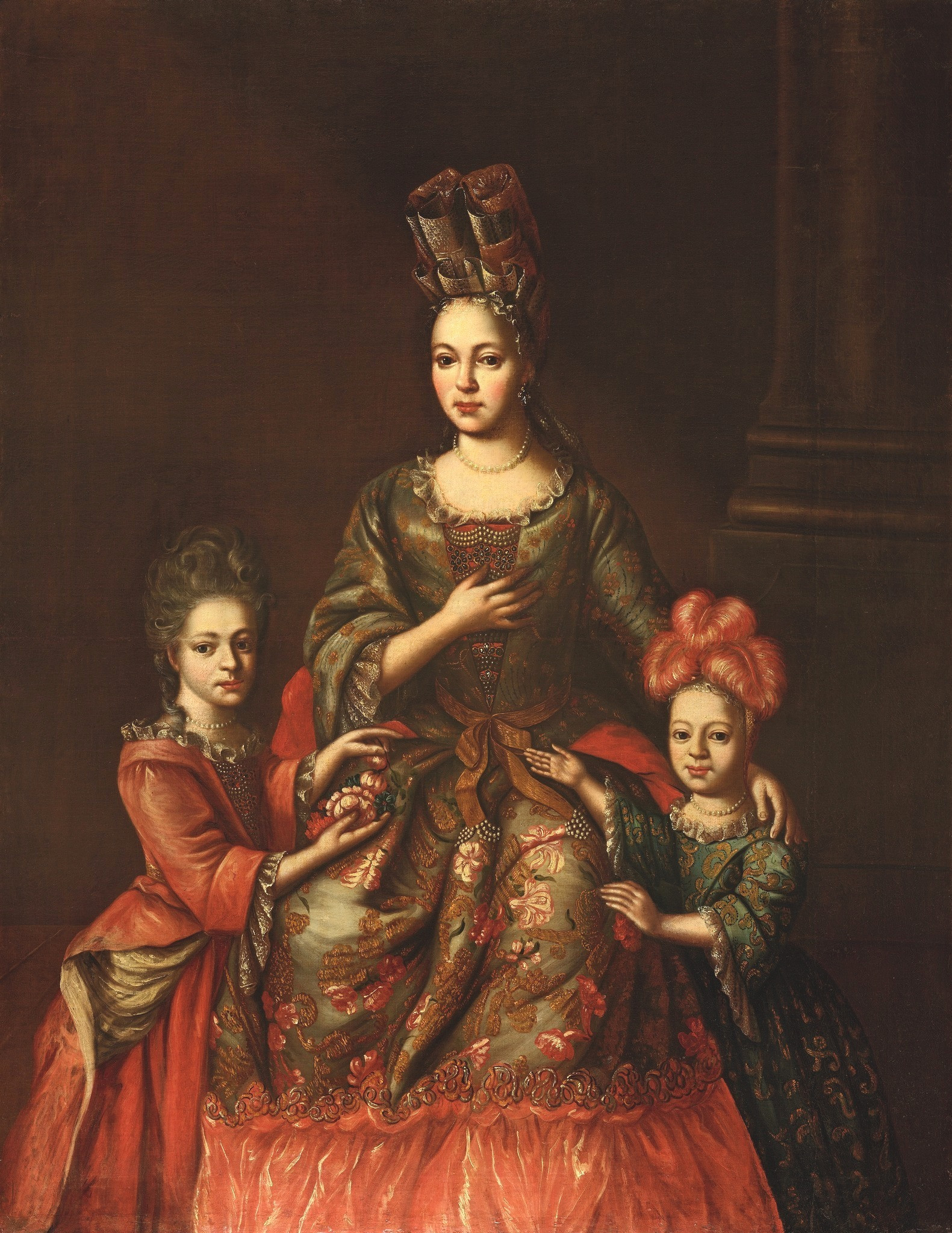 На портрете неизвестного автора изображена жена московского губернатора Кирилла Нарышкина — Анастасия Нарышкина, урожденная княжна Мышецкая. Картина была создана в самом начале XVIII столетия — между 1709 и 1715 годом. В то время портретная живопись еще во многом опиралась на русские иконописные каноны, именно поэтому художник изобразил фигуры подчеркнуто статичными и двухмерными. Дети же выглядят уменьшенными копиями взрослых: в ту эпоху художники не подчеркивали на портретах особенности детской мимики и анатомии, даже их наряды в точности повторяли обычную взрослую одежду.