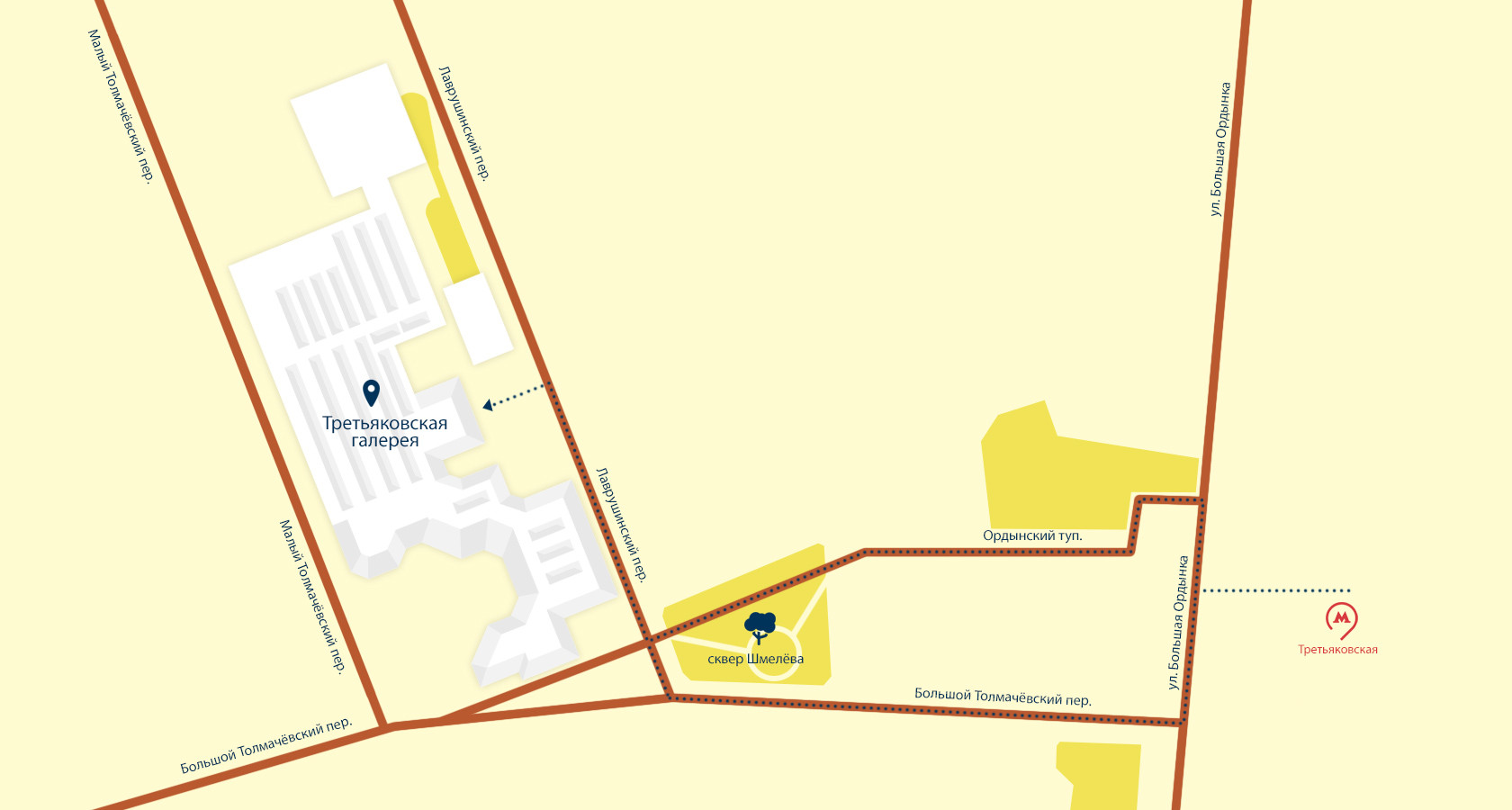 Главный корпус Третьяковской галереи находится в Лаврушинском переулке, дом 10. Добираться туда удобнее всего на метро: ближайшая станция так и называется — «Третьяковская». От нее нужно повернуть налево, перейти Большую Ордынскую улицу, пройти по Большому Толмачевскому переулку или Ордынскому тупику: они идут параллельно. После сквера — направо, и вы окажетесь в Лаврушинском переулке.