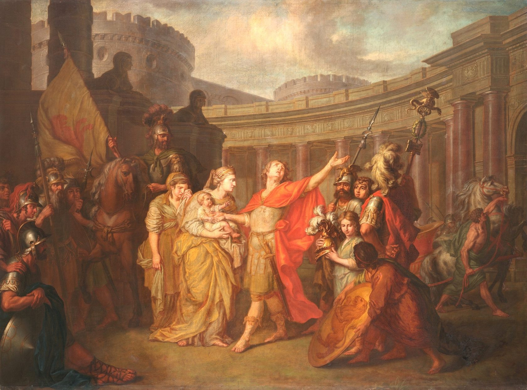Художник Антон Лосенко написал картину «Прощание Гектора с Андромахой» в 1773 году по заказу Екатерины II. Сюжет он взял из поэмы Гомера «Илиада»: троянский военачальник Гектор отправляется на битву с греками, прощается со своей женой Андромахой и маленьким сыном Астианактом. Лосенко запечатлел героя в момент обращения к богам: