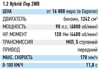Мотор рабочим объемом 1,2 л с двумя форсунками на цилиндр выдает 90 л.с. Силовой агрегат может сочетаться как с роботизированной коробкой, так и с 5-ступенчатой «механикой». У двигателя в достатке темперамента во всех режимах. И поддерживать его ДВС помогает электромотор. Так что фактически перед нами «мягкий» гибрид – редкость в компактном классе. Трехсильный электродвигатель питается от литий-ионной батареи и заменяет в том числе стартер и генератор. Он включается в работу только при разгоне и наборе скорости с хода, что заметно уменьшает нагрузку на четырехцилиндровый ДВС, а следовательно, и расход топлива. Но, как понятно, ехать в электрорежиме не получится.