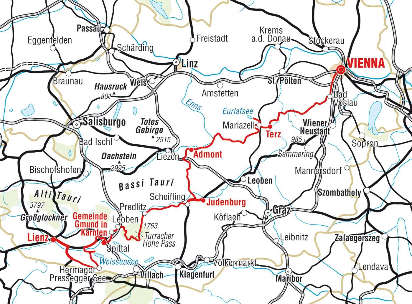 Выехать из города по дороге 317, а затем двигаться по дорогам 96 и 97 на Предлиц. Продолжать маршрут по дороге 95 на перевал Туррахерхеэ, а затем повернуть направо на Леобен и Гмюнд, к которому ведет дорога 99.
