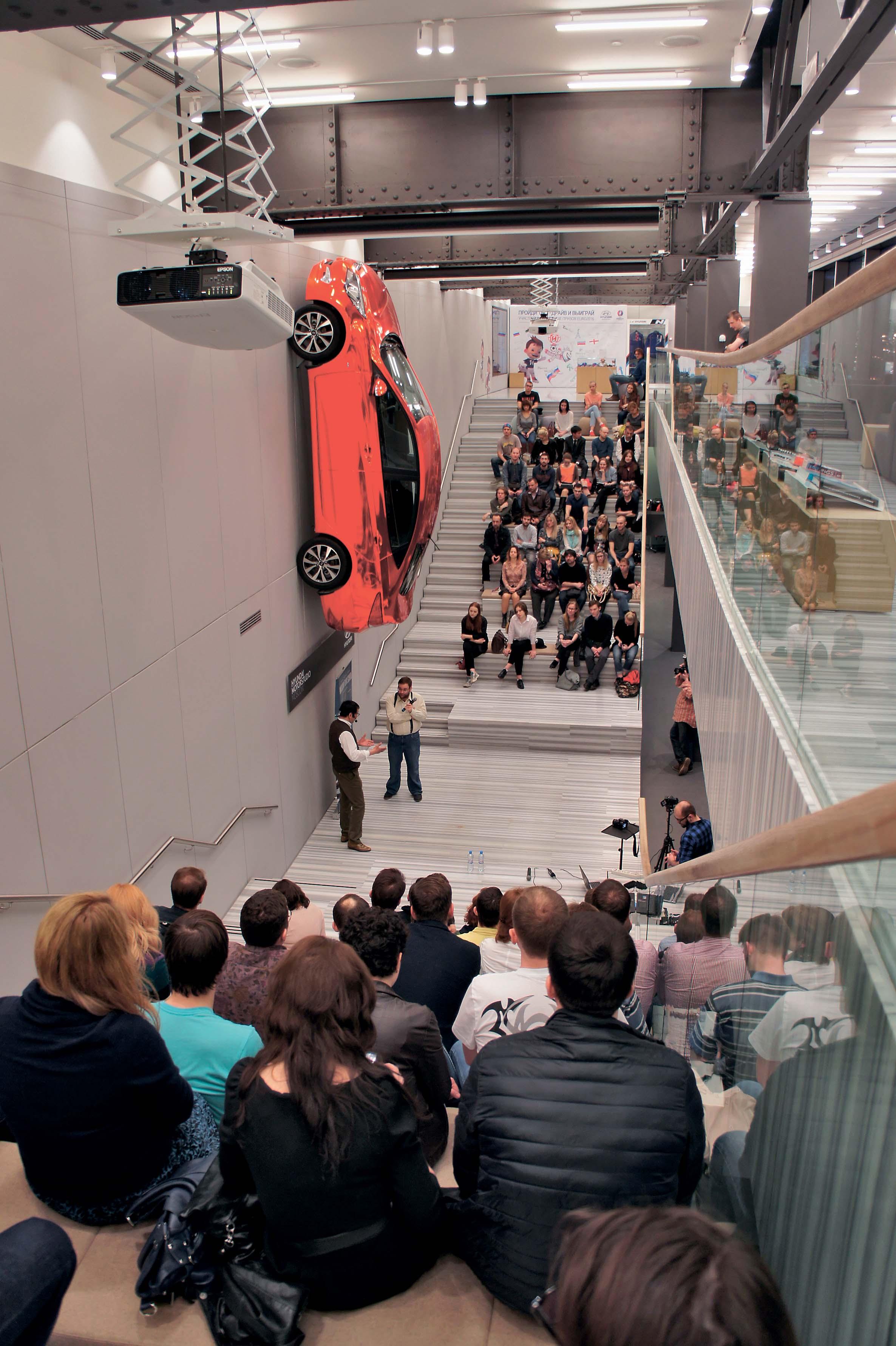 «Hyundai MotorStudio Москва» – площадка, предназначенная как раз для такого общения. Два этажа, пять функциональных зон. Двухсторонняя лестница в форме сердца запросто превращается в подобие амфитеатра. Между пролетами парит главный бестселлер Hyundai в России – седан Solaris. И это первый намек гостям: попробуйте взглянуть на привычные вам вещи под непривычным уголом зрения. Популярный бренд – это не скучно и не обычно.