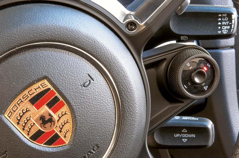 Салон изменился. Теперь кажется, что сидишь в 911-м. Классический щиток Porsche – три полукруглых циферблата, на первом плане большой тахометр: заканчивается шкала цифрой 8000, а красная зона начинается на отметке 7200 об/мин. На нижней спице руля, как в 911-м, появилась ручка Mode, позволяющая выбрать желаемый вариант настроек: Normal, Sport, Sport Plus или Individual. А еще есть красная кнопка Sport Response, и если ее нажать, то независимо от установленных настроек турбина и коробка в течение двадцати секунд будут готовы работать на максимуме собственных возможностей.