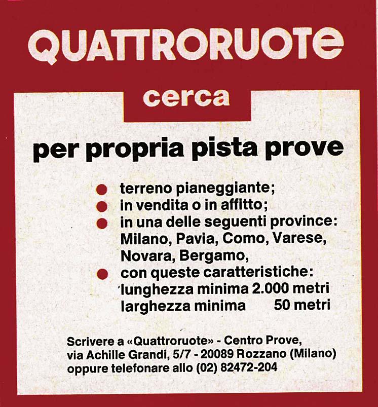 Все началось с этого объявления, появившегося на страницах итальянского Quattroruote более 30 лет назад. Цель: найти достаточно свободный участок для постройки своего комплекса. Ни одно другое специализированное издание и сегодня не может похвастаться собственным полигоном с такими возможностями.