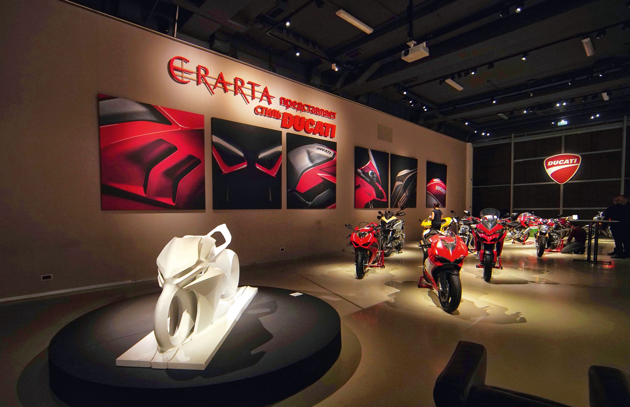 Максимум, что потребуется, — оказаться в Питере до 16 июня и добраться до музея современного искусства Эрарта. В чьих залах с приглушенным светом, собственно, и раскинула коллекцию исторических и современных мотоциклов, а также фотографии, примеры дизай н-проектов, велосипеды, рекламные плакаты и другие фирменные артефакты выставка «Стиль Ducati». Здесь можно не только проникнуться насыщенным спортивными достижениями прошлым бренда, прочувствовав харизму итальянского дизайна и мощь современной инженерной