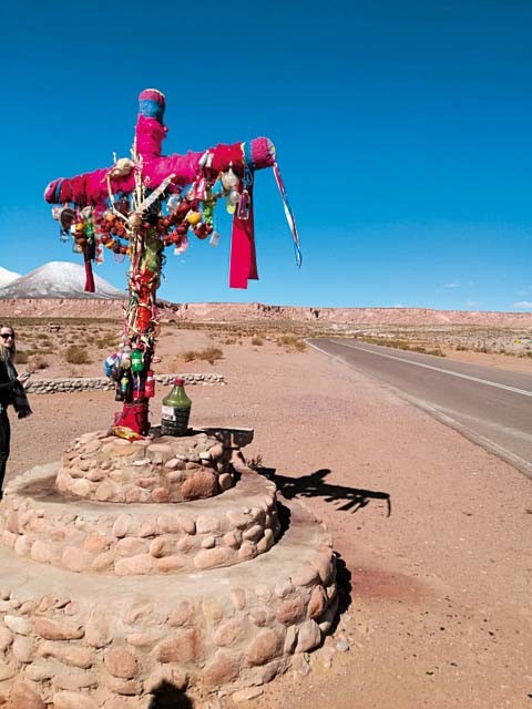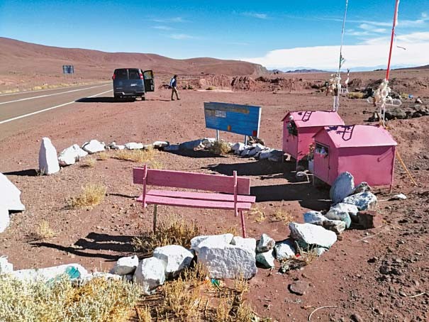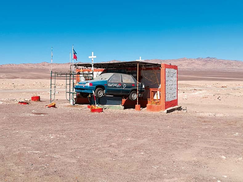 Контрасты. Сухие. Ослепляющие. Дорога, что ведет от аэропорта шахтерского городка Камала на севере Чили до Сан-Педро-де-Атакама в самом сердце пустыни, представляет собой длинную полосу асфальта в обрамлении яркого множества разномастных часовенок. Там и тут взгляд натыкается на груды того, что когда-то называлось автомобилем. Такие стихийные монументы служат напоминанием об авариях на этом маршруте, который старый трансфер-вэн Chevrolet переваривает с трудом, постоянно подпрыгивая. Вокруг — настоящий лунный пейзаж: голая земля и камни. На горизонте Анды...