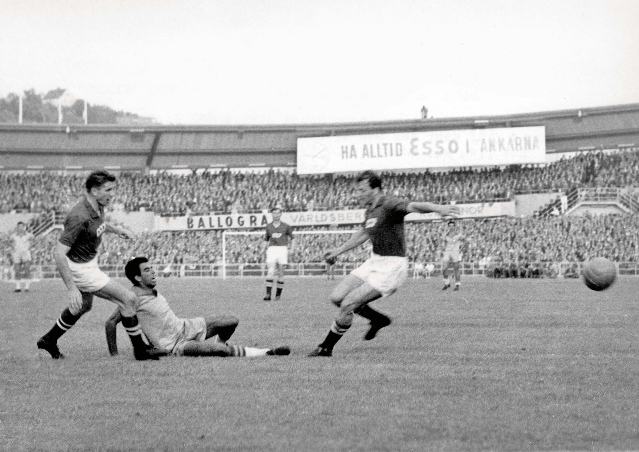 Советские футболисты, появившись на чемпионатах мира, находились в числе фаворитов, ведь в 1958 году сборная СССР прибыла в Швецию в статусе олимпийского чемпиона. Это была великая команда, собранная Гавриилом Качалиным. Команда со Львом Яшиным в воротах, которая два года спустя выиграет кубок Европы. Именно Качалину удалось убедить спортивное руководство страны организовать сборную на постоянной основе, а не созывать от раза к разу. В те годы наши футболисты отправлялись на чемпионаты мира исключительно за золотыми медалями. Но в 1958 году помешал случай. Сборная лишилась своего лидера Эдуарда Стрельцова, оказавшегося под следствием, и противостояние Пеле — Стрельцов не состоялось. Бразильцы советскую команду обыграли, правда, забил тогда Яшину не Пеле, а Вава. Команда Качалина сумела выйти в 1/4 финала, а там было 0:2 от сборной Швеции.