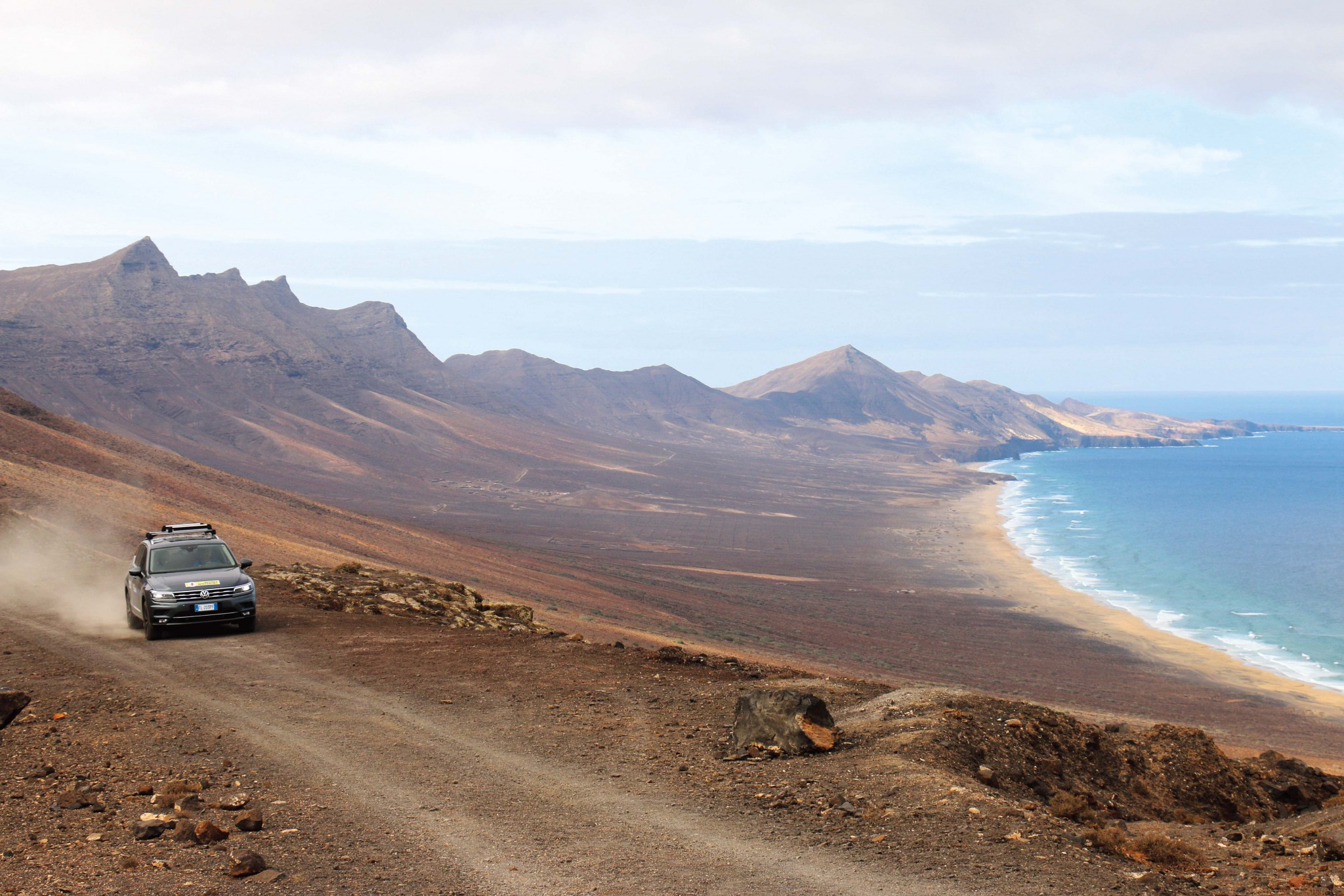 После пересечения острова вновь грузимся на паром. И уже через час швартуемся в бухте соседнего Фуэртевентура, знаменитого своими многокилометровыми пляжами, обтесанными ветрами пейзажами и волнами Атлантики, что несут мягкие ноты спокойствия и безмятежности. Преодолеваем его по всей длине, до самого юга, где вытянулся полуостров Хандия, с его грунтовками и панорамами, гипнотизирующими дикой красотой. Эти участки тоже не способны доставить беспокойства Tiguan, который чувствует себя своим в доску в лабиринте пыльных дорог.