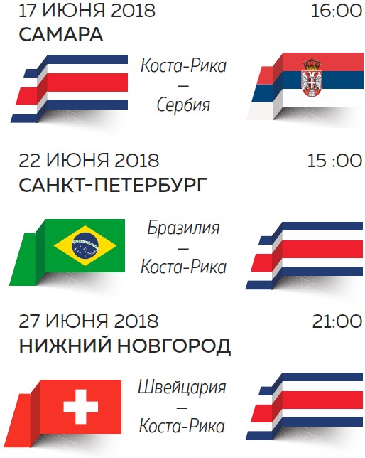 Четыре года назад сборная Коста-Рики всерьез заявила о своем притязании на титул. В 2014 году в Бразилии никто не воспринимал эту команду всерьез, однако после первых двух матчей, которые завершились победой над сборными Уругвая и Италии, все заговорили о новом футбольном чуде. Одним из лучших тогда был полузащитник Ельцин Тахеда («Лозанна»), нареченный в честь первого президента России, который импонировал родителям футболиста. Отборочный турнир к чемпионату мира сборная Коста-Рики провела неровно, зато отметилась разгромом команды США (4:0). В этом матче принял участие и Ельцин, которого мы увидим на российских футбольных полях. А если совсем серьезно, то надо понимать, что последний рубеж сборной Коста-Рики держит вратарь мадридского «Реала» Карлос Навас — двукратный победитель Лиги чемпионов. Есть кому и забивать: Маркос Уренья («Лос-Анджелес») и Брайан Руис («Спортинг»).