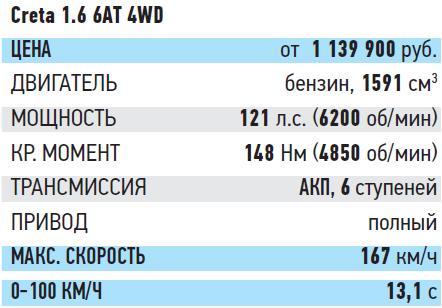 Двигатель 1.6 и полный привод – с апреля нынешнего года компактный кроссовер Сreta доступен к заказу у всех российских дилеров Hyundai и в такой версии. Коробки передач – «механика» или АКП – шестиступенчатые, такие же, как у прочих модификаций модели. Почему же пришлось так долго ждать? Чистый маркетинг. Среди новоиспеченных владельцев Creta преобладают те, кому для повседневных передвижений за глаза хватает и мотора в 120 «лошадок» с лишним, и переднего привода. Выход новой версии приведет сонм покупателей к равновесию, и половина продаж станет приходиться на машины с интегральной трансмиссией.