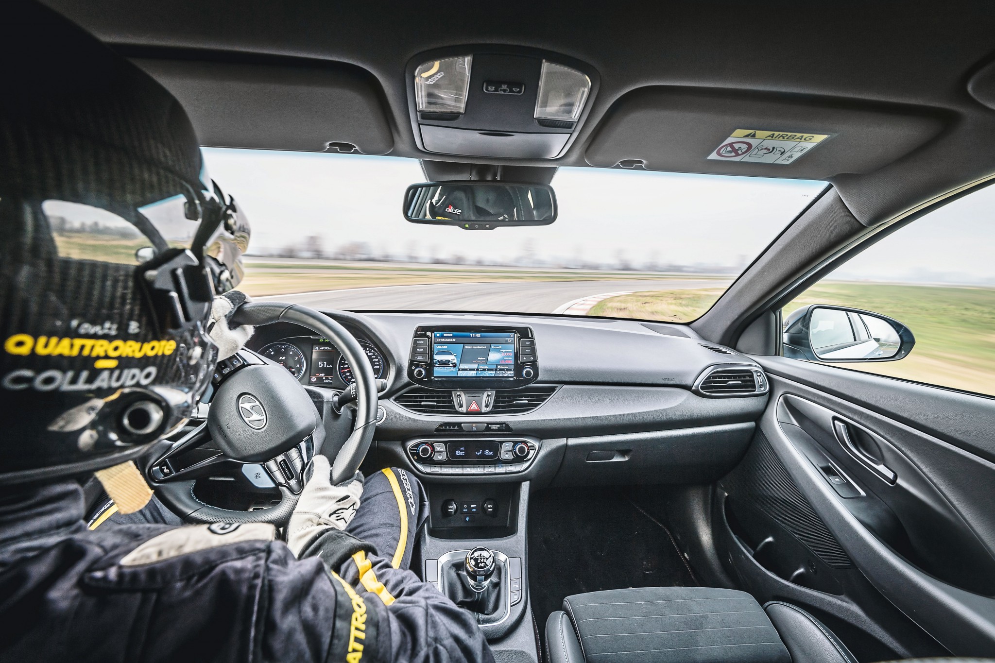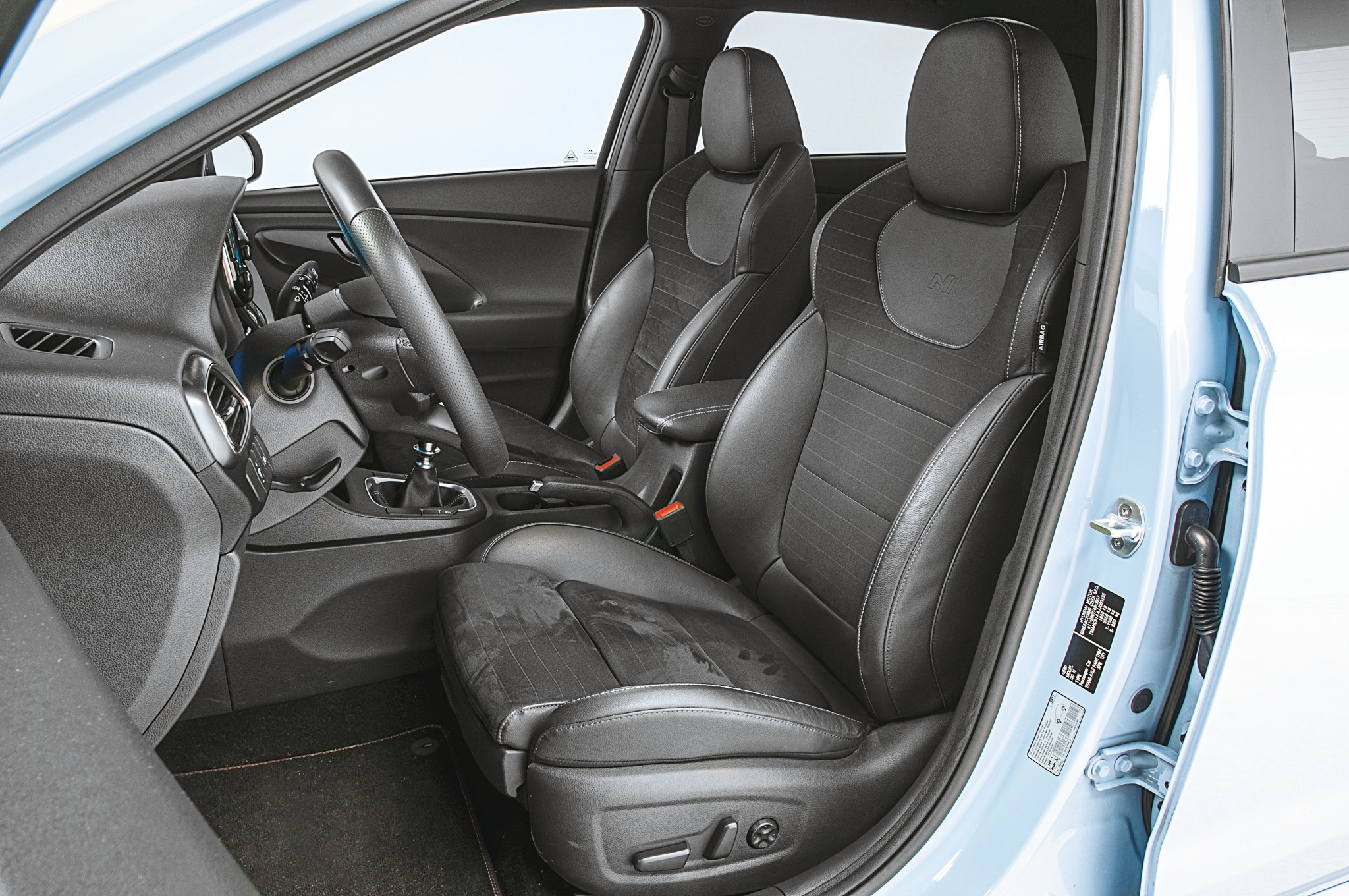 Без преувеличения отличные передние кресла с электрорегулировками получили более выраженные боковые валики, существенную поддержку плеч и подушку с регулировкой длины. На руле появились две голубые клавиши, отвечающие за стандартные режимы вождения (Eco, Normal и Sport) слева и N Grin Сontrol (N и Custom) справа. Они нужны для установки параметров двигателя с шасси и представляют собой нервный центр i30 N, поскольку позволяют существенно менять управляемость и реакции автомобиля, чтобы делать его более эффективным на треке, удобным на дороге или же просто повысить градус азарта от управления.