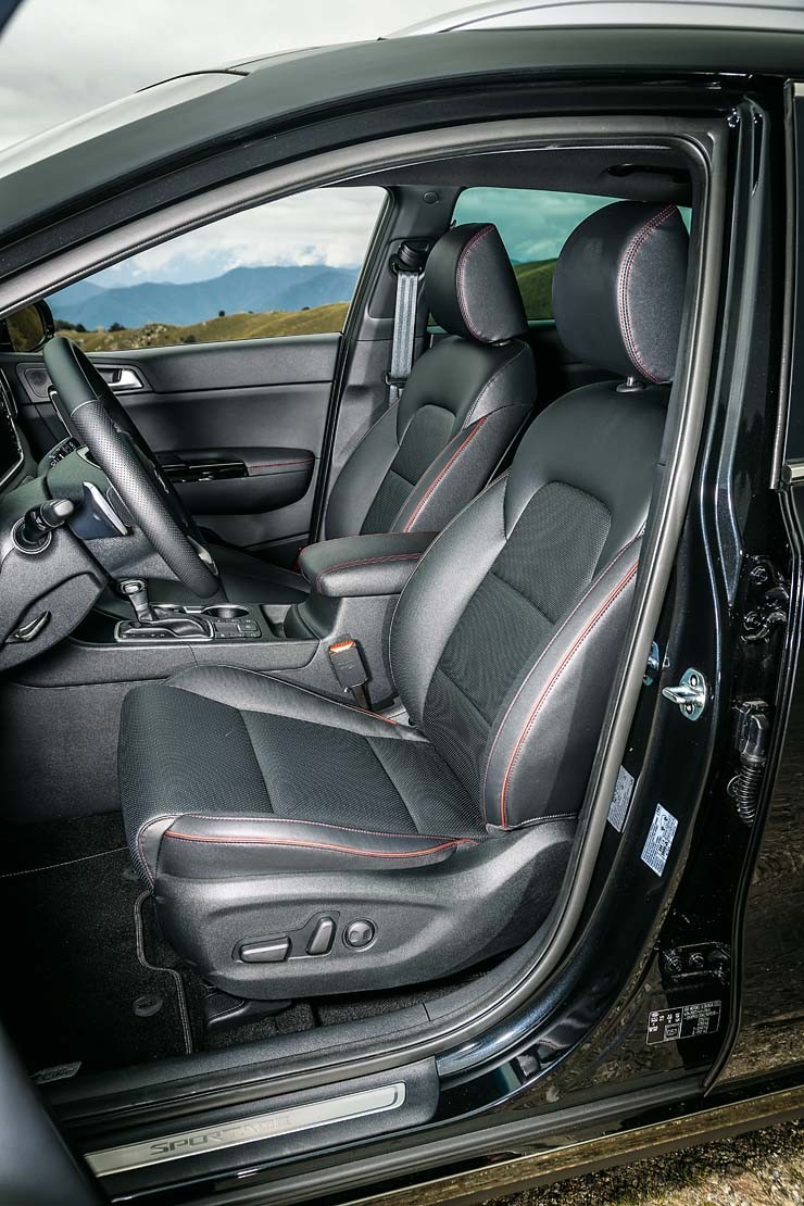 Главный козырь обновленного корейского кроссовера — бортовая электросистема 48 В в сочетании с двухлитровым ДВС, восьмидиапазонной гидромеханической АКП (дебютантка модели) и полным приводом. Электрокомпонентов хотя и недостаточно, чтобы сертифицировать автомобиль как полноправный гибрид (бесплатно в центры европейских городов не въедешь), однако они создают положительный эффект: снижается расход топлива, а следовательно, и вредные выбросы. Версия Sportage с двухлитровым мотором никогда не была рекордсменом по экономичности, но теперь вклад гибридной начинки чувствуется: пробег на одном литре топлива вырос с 12 до 13,7 км. Интересный показатель для тех, кто ищет кроссовер с характером и харизмой на каждый день. В том числе, поскольку улучшения, как логично предположить, коснулись прежде всего использования в городе и за его пределами. Управление мягким гибридом Kia (в нашем случае — в топовом исполнении) очень напоминает езду на традиционной версии: в пробках старт-стоп гасит мотор намного раньше, чем обычно, но при перезапуске почти ничего не изменилось. Более того, иногда возобновление работы мотора кажется еще более грубым, автомобиль даже чуть дергается вперед. Всего на несколько сантиметров, ничего страшного, однако это может раздражать. В остальном это привычный Sportage: на фоне многих конкурентов он здорово едет и дарит достойный уровень комфорта за счет просторного салона, удобных кресел и оснащения, в том числе многочисленными ассистентами водителя.