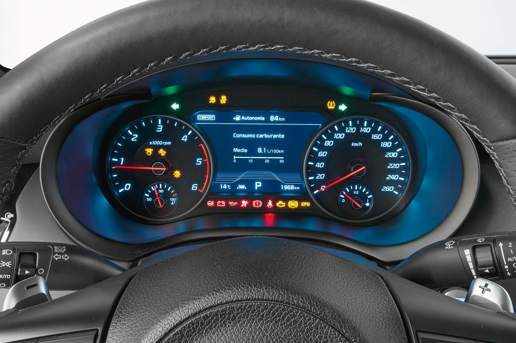 Водительское место скомпоновано по-спортивному. Посадка низкая — ноги вытянуты, а подушка кресла расположена всего в 45 см над асфальтом. Руль стоит идеально вертикально, средний наклон составляет 17°. Он небольшого диаметра (37 см), обод скошен в нижней части, чтобы не мешать ногам. У кресла плотный хват, достаточный, чтобы удерживать корпус, но не затруднять посадку и высадку. Электрорегулировки с большим диапазоном позволяют устроиться очень удобно. Щиток состоит из двух больших аналоговых приборов, разделенных центральным TFT-экраном, на котором отображаются данные бортового компьютера. Передняя панель — простая и почти минималистская — сочетается с высоким и выраженным тоннелем, четко разделяющим передние места и тянущимся до заднего ряда.
