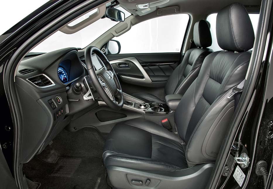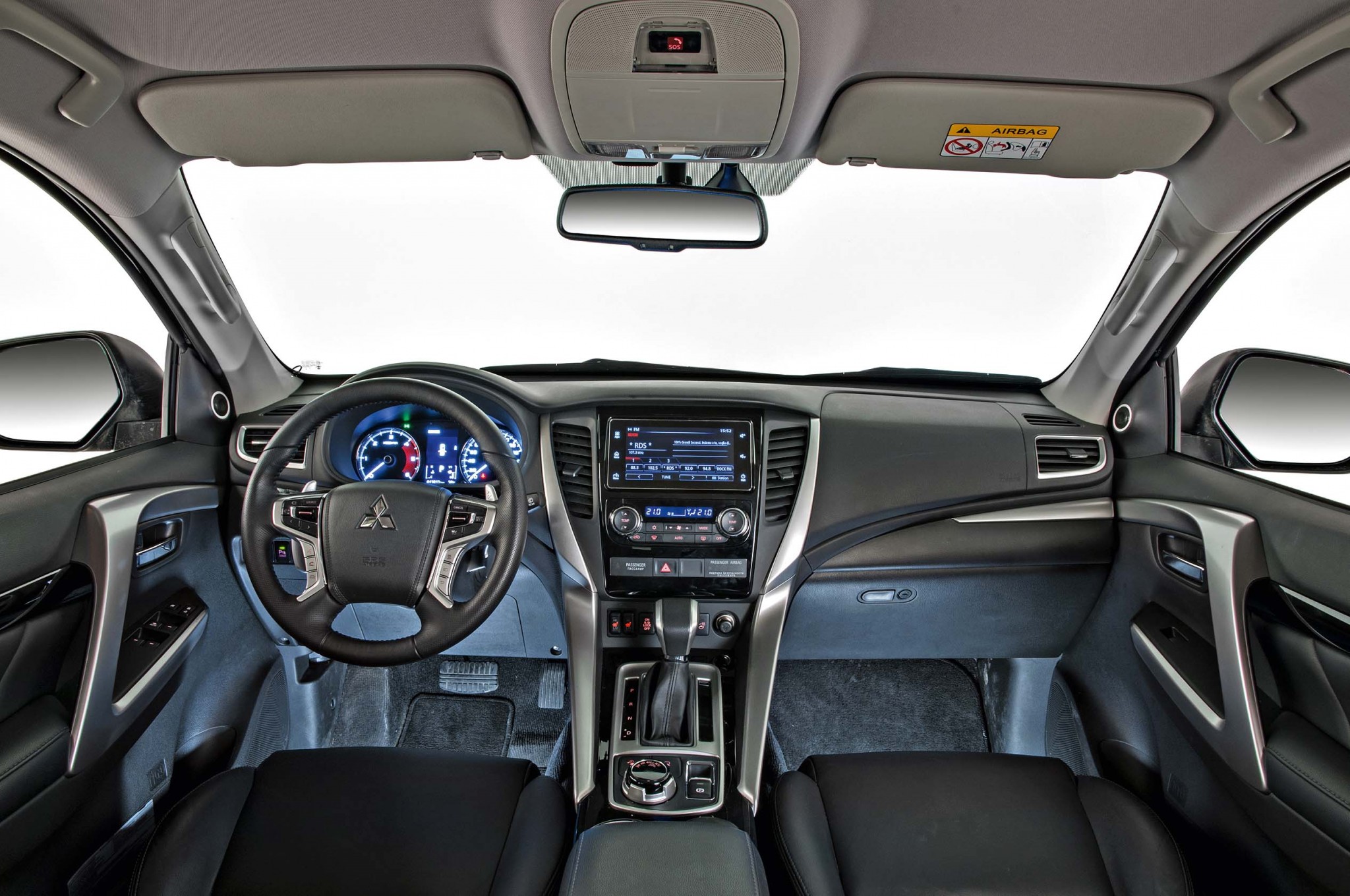 Рулевое колесо с четырьмя спицами, щиток приборов с цветным дисплеем, а на центральной консоли (и это одно из самых броских отличий от родственного L200) — серебристая накладка с «внедорожными» ручками как со стороны водителя, так и пассажира, стилистически идентичными тем, что фигурируют на измененной обшивке дверей.