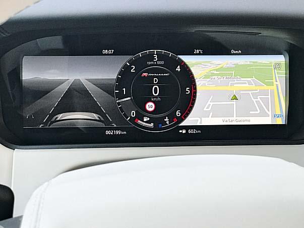 Разговор о дисплеях на этом закончить не получится, потому что в салоне есть еще и третий экран – жидкокристаллическая матрица диагональю 12,3 дюйма на месте приборного щитка: спидометр и тахометр – просто картинка, но вид легко сконфигурировать на свой вкус. Можно менять расположение различных индикаторов, на первый план выводить карту навигации, акцентировать внимание на оборотах или скорости.