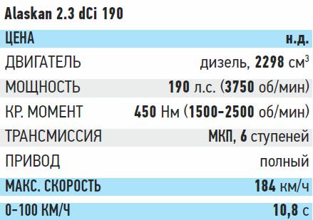 Под капотом – проверенный временем мотор 2.3 dCi, который устанавливают и на Renault Master. Здесь он в версиях форсировки 160 и 190 л.с., а сочетаться может с 6-ступенчатой «механикой» или 7-диапазонным автоматом. Привод может быть как на два, так и на четыре колеса. В последнем случае предусмотрена возможность включения понижающего ряда в коробке передач, что позволяет Alaskan