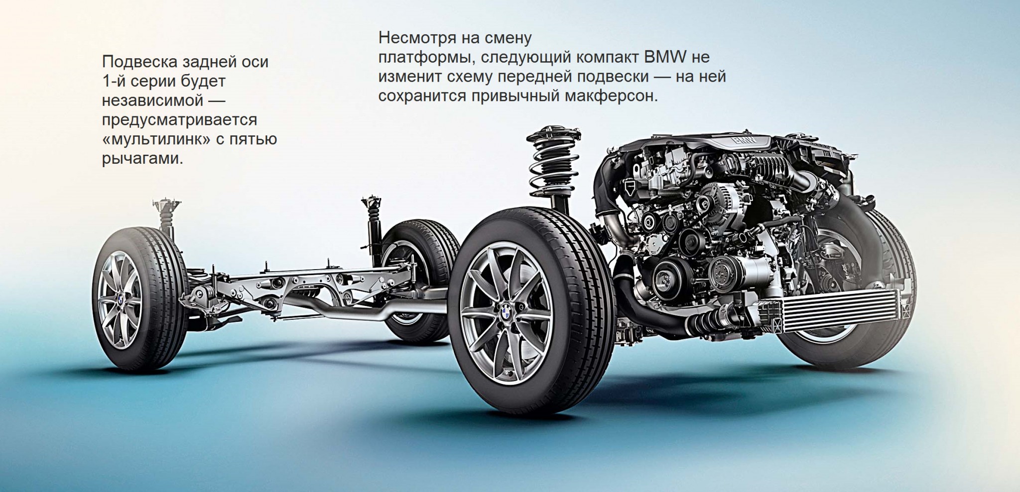 Причинами серьезной метаморфозы 1-й серии стали, естественно, логика производства и масштабная экономия. Архитектура, использованная для баварского компакта, будет называться Faar — это дальнейшее развитие платформы UKL, которая дебютировала на актуальном поколении MINI, а затем перекочевала на BMW X1 и Active/Gran Tourer 2-й серии. Новая платформа, как и UKL, позволит выпускать как полноприводные версии, так и гибриды plug-in, но вдобавок она открывает возможность разработки чистых электрокаров. Устанавливать электромотор получится на задней оси, а компоновка предполагает еще и достаточно пространства для размещения довольно емких аккумуляторов, которые используют на гибридах plug-in.