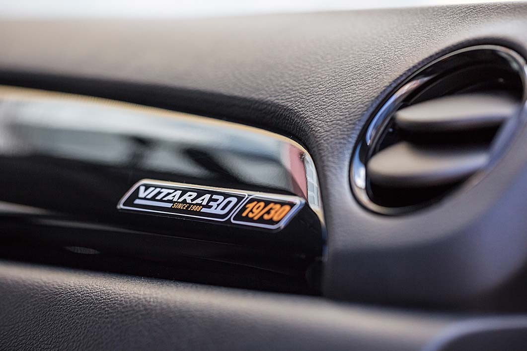 У юбилейной Vitara на задних стойках появились особые эмблемы, напоминания о юбилее есть даже на ковриках. Часы Kanji в центре панели — одна из главных фишек спецсерии, напоминающая о японском происхождении легендарной модели. Красная прострочка подчеркивает элегантность салона, оформленного в темных тонах.