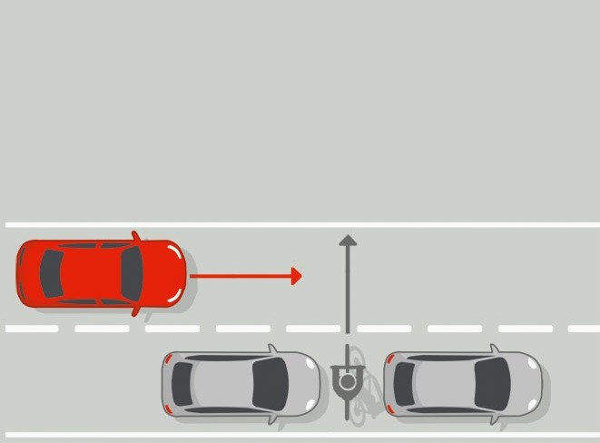 Велосипед выскакивает из-за двух припаркованных машин и пересекает дорогу со скоростью 15 км/ч; автомобиль движется со скоростью 35 или 60 км/ч.