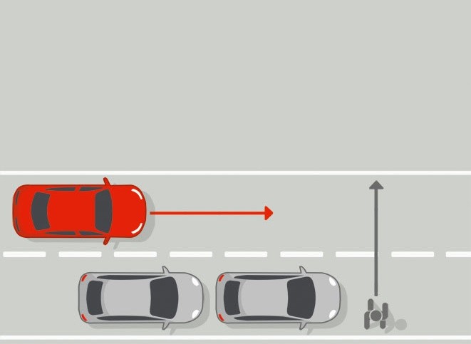 Автомобиль движется со скоростью 20 км/ч, манекен выходит из-за двух припаркованных машин. Если столкновения не происходит, скорость возрастает.