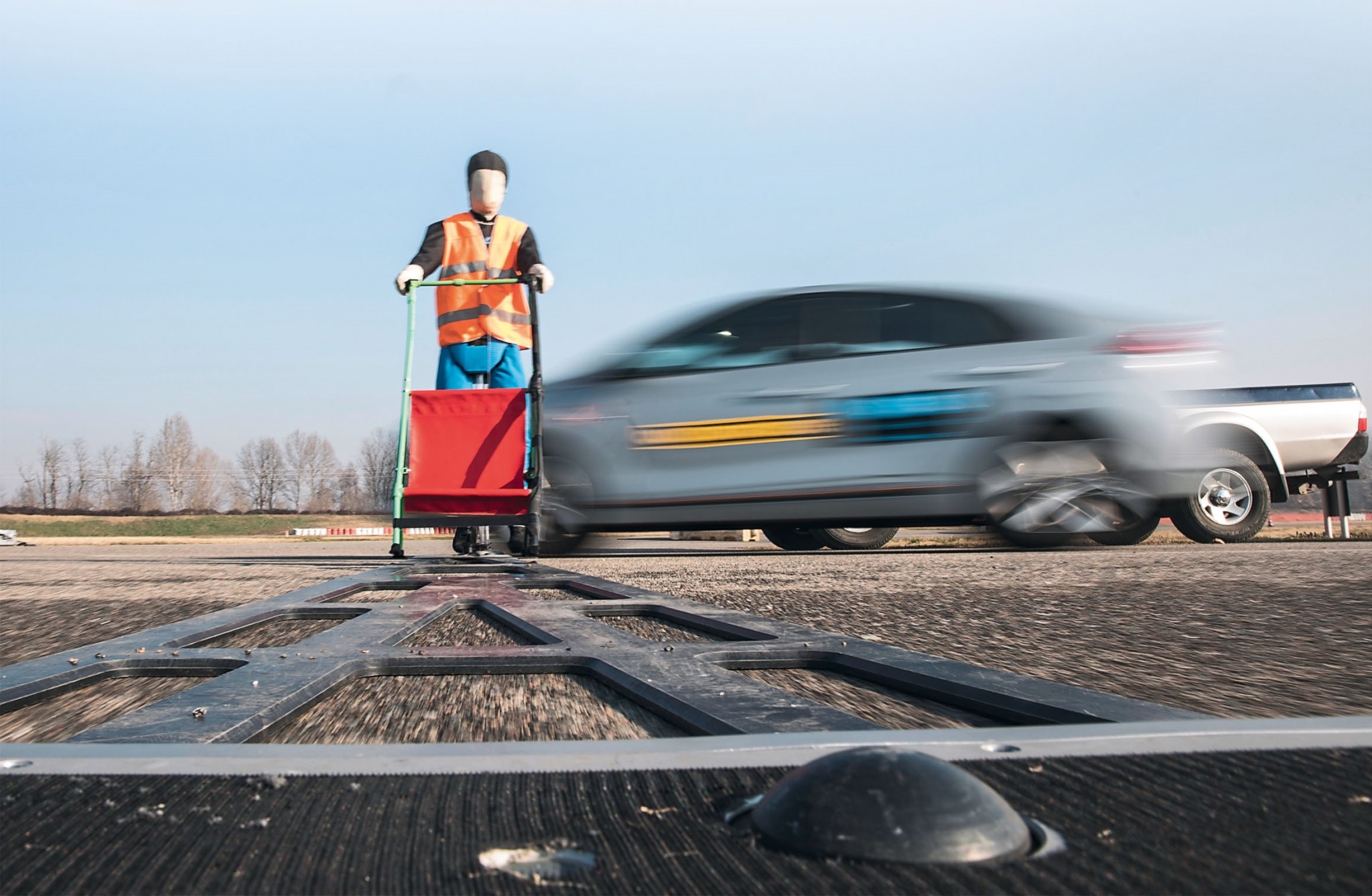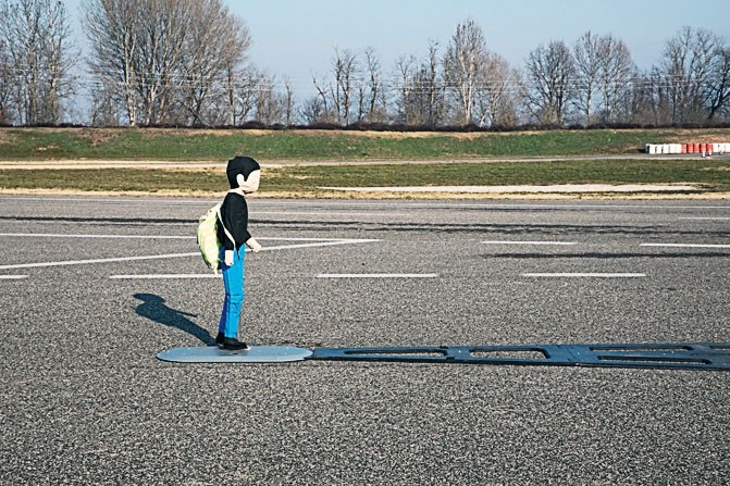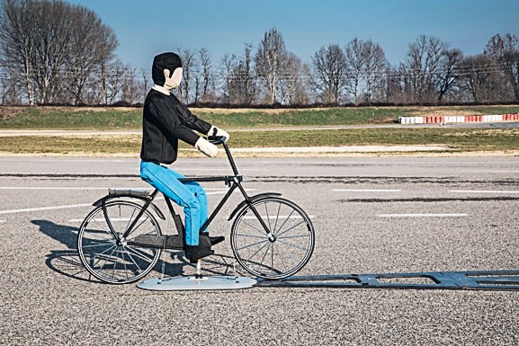 Наши испытания основаны на методике Euro NCAP — дополненной и усложненной. Взрослый «пешеход», например, находится не в открытом поле, а внезапно выскакивает из-за двух автомобилей, припаркованных справа. Мы его одели в куртку со световозвращающими элементами и снабдили фальшивой коляской. Доработали и манекен ребенка: повесили ему рюкзак на спину. И максимально усложнили испытание с участием велосипедиста — он выезжает из-за припаркованных автомобилей (испытания Euro NCAP предполагают, что он всегда находится в поле зрения).