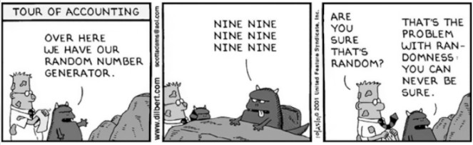 Вопрос, который Дилберт задает в приведенном ниже комиксе, напоминает нам о том, что в обыденной речи слово «случайный» отсылает сразу к двум концепциям: во-первых, к неупорядоченности набора данных, а во-вторых, к непредсказуемости некоего процесса. Когда Дилберт сомневается, что выдаваемая троллем последовательность девяток действительно случайна, он имеет в виду случайность в смысле отсутствия порядка.