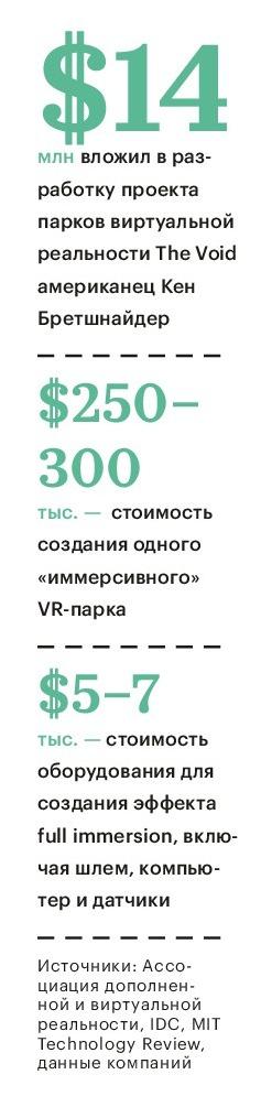 Самая известная в мире компания, развивающая развлекательные VR-парки, — американская The Void, основанная серийным предпринимателем Кеном Бретшнайдером. Идеей создания полноценного виртуального парка он занимается с 2014 года, в проект вложил уже около $14 млн собственных средств. Первый коммерческий образец от The Void появился только летом 2016 года: в Музее мадам Тюссо в Нью-Йорке в партнерстве с Sony Pictures был представлен тематический игровой парк по сюжету фильма «Охотники за привидениями».