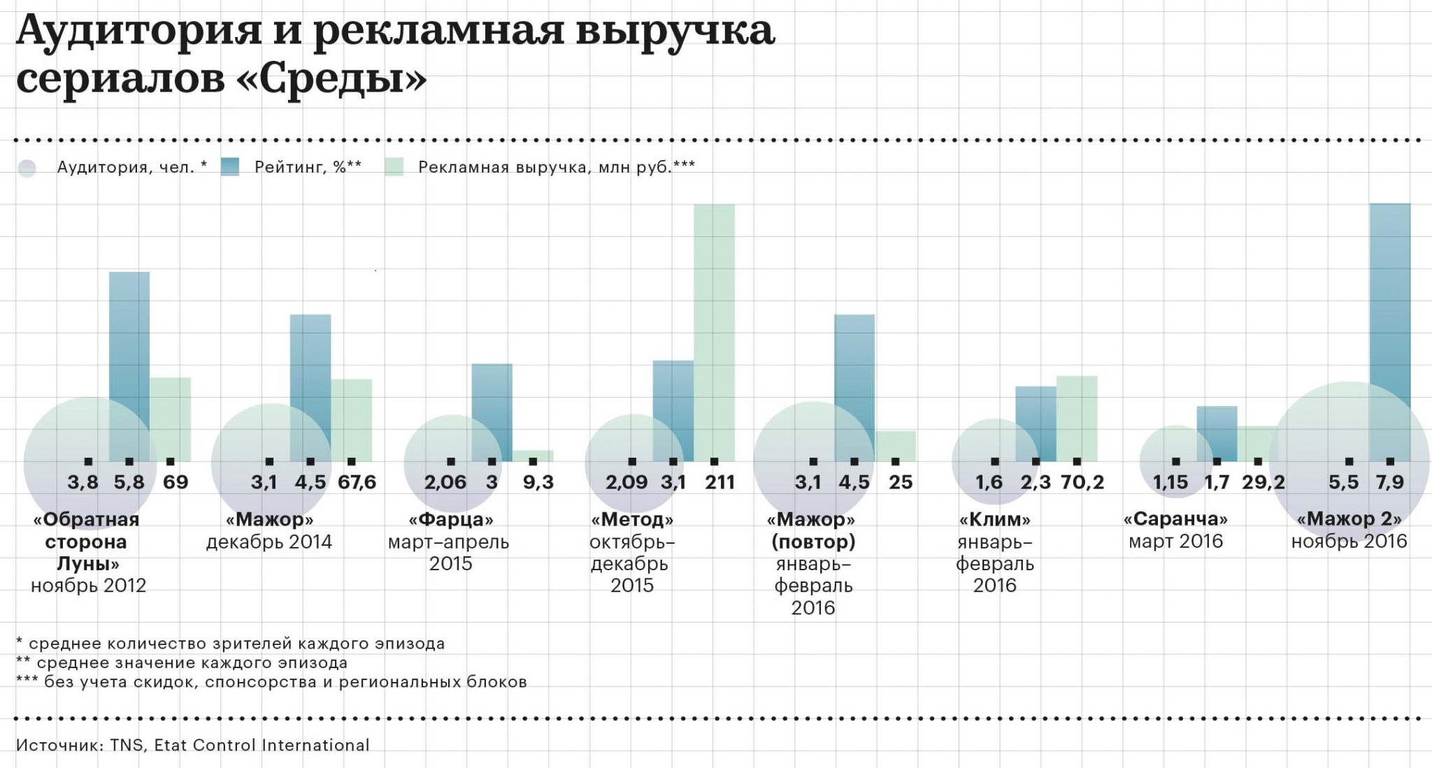 «Среде» участники рынка отводят достаточно скромное место, если измерять компанию в единицах производства контента. В 2015 году у компании было три премьерных сериала (31 час) — «Лучше не бывает», «Метод», «Фарца». Это составляет 0,23% от всех премьер, подсчитали для РБК в KVG Research. Для сравнения, лидер 2015 года — «Солярис промо продакшн» («Дом-2», сериал «Остров») — произвел 930 часов премьерного контента. На втором месте — «Красный квадрат» с 910 часами.