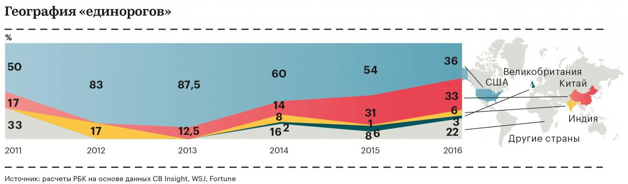 С другой стороны, венчурные специалисты начали пристальнее смотреть на Восток. Расчеты журнала РБК показали: если три года назад список «единорогов» состоял преимущественно из американских компаний, то в нынешнем топе лишь треть позиций — проекты из США, примерно столько же — из Китая. Кстати, азиатские компании в отличие от американских быстрее достигают оценки в $1 млрд при меньшем объеме инвестиций. Например, показатель valuation-to-funding (соотношение оценки проекта к вложенным в нее деньгам) у самого крупного «единорога» Uber — 5,3 к 1, а у второй по стоимости компании — китайского производителя устройств Xiaomi — 31,8 к 1, подсчитал WSJ.