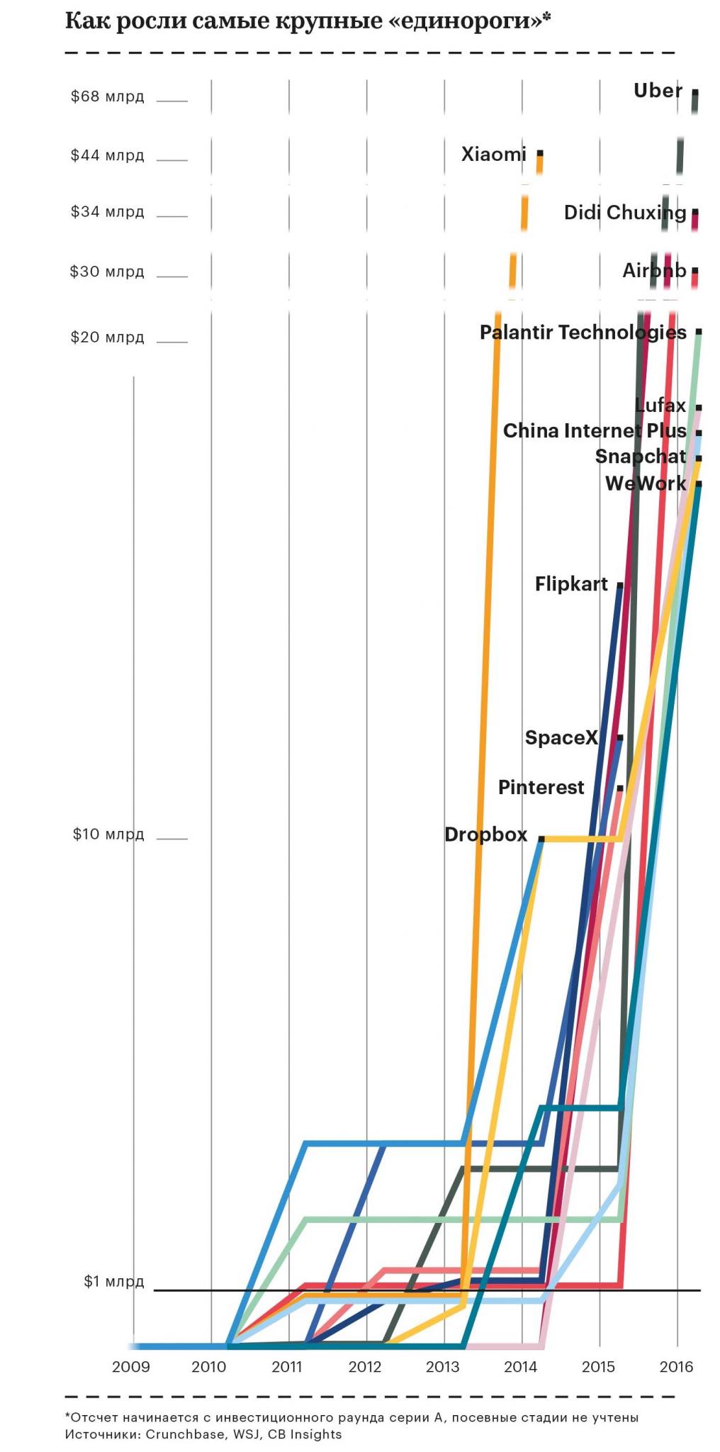 Захватившая венчурный рынок волна «единорожья» вылилась в то, что список миллиардных компаний «мельчает». По состоянию на конец ноября 2016 года лишь 25 проектов смогли получить инвестиционную оценку свыше $5 млрд, а преодолеть $10 млрд удалось лишь 15 компаниям — на них приходится более 60% общей оценки «поголовья». Более 10% общей стоимости «единорогов» создает онлайн-сервис вызова такси Uber.