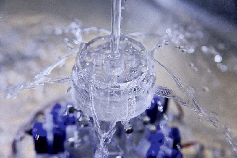 HydroMorth — одна из самых эстетичных разработок TMG. Устройство инженеры называют «динамической пространственной водной мембраной». На изобретение их вдохновило мытье посуды: похожий эффект возникает при направлении струи воды на ложку. По сути HydroMorth — это специальный кран. Вытекающий поток воды создает цельную полусферу, которая может разбиваться на более сложные формы десятью специальными датчиками в форме наконечника стрелы. Сверху за направлением потока и движением приближающихся к нему физических объектов наблюдает камера, передающая сигнал в компьютер. Тот, в свою очередь, управляет микроконтроллером, отвечающим за подъем или спуск датчиков.