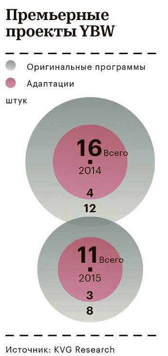 И если продюсеры решились расстаться с СТС, то YBW — нет. Напротив, компания стала одним из главных производителей контента для канала. К примеру, в 2014-м на YBW пришлось 35% премьер СТС, подсчитала для журнала РБК компания KVG Research. Для сравнения: на канале «Россия» в 2014–2015 годах тот же показатель составил 0,54 и 0,15% соответственно.