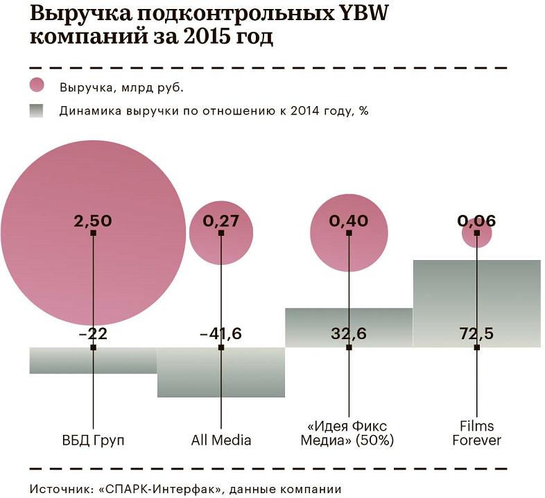 Еще одно направление, связанное с масштабированием бизнеса, — дистрибуция. В 2011-м совладельцы YBW зарегистрировали компанию All Media, которая является эксклюзивным дистрибьютором не только проектов YBW, но и кинопроизводителей (фильмы «Страна чудес», «Завтрак у папы» и др.). По словам Жалинского, All Media должна была обслуживать библиотеку YBW, но выросла в самодостаточный бизнес. Зарабатывать он начал только в 2014 году — при выручке 470 млн руб. чистая прибыль составила почти 11 млн руб. По итогам 2015 года компания сработала почти в ноль при выручке 275 млн руб.