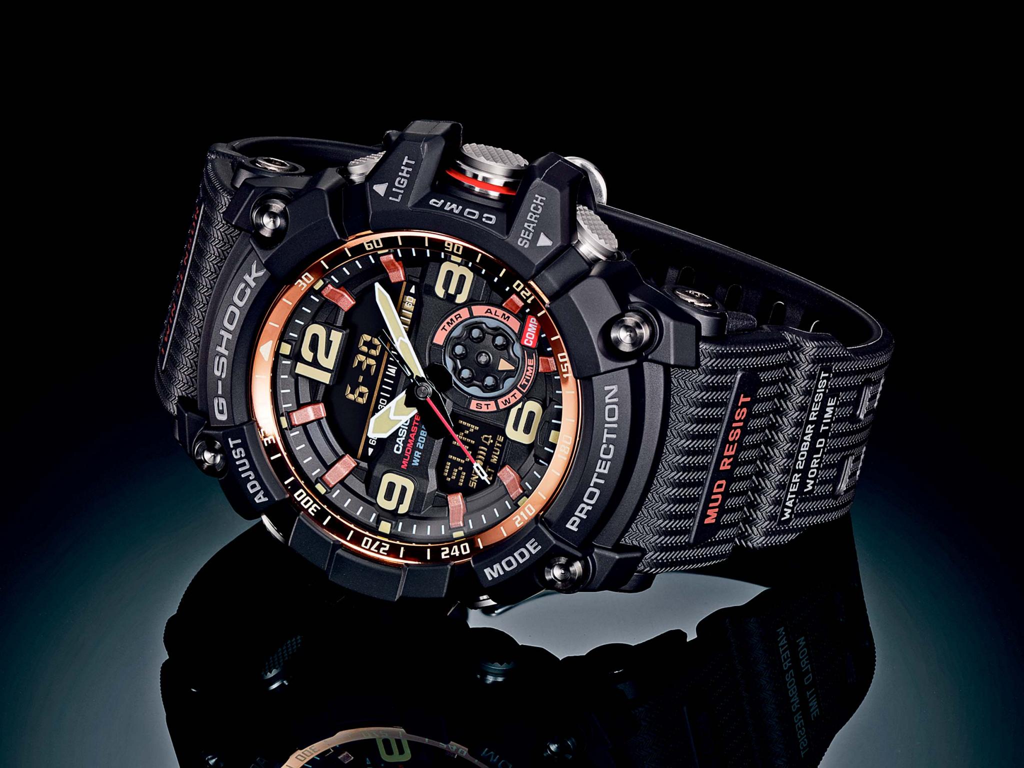 В линейке Master of G бренда Casio G-Shock появились новые модели Gulfmaster GN-1000 и Mudmaster GG-1000 с безелем из искусственно состаренного розового золота. Часы предназначены для выживания в экстремальных условиях. Корпус Mudmaster надежно защищает от вибрации, грязи, пыли, а технология Twin Sensor определяет направление движения и температуру. Часы Gulfmaster оборудованы термометром и цифровым компасом, а также индикатором приливов и отливов.