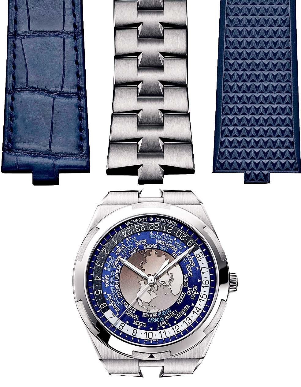 Символом обновленной линейки стальных часов Overseas стал золотой ротор автоподзавода в виде розы ветров. Его движение, видимое сквозь прозрачную заднюю крышку корпуса, подобно вращению морского компаса. Поэтому вся коллекция старейшей мануфактуры Vacheron Constantin наполнена духом странствий и словно бы зовет в путь — особенно последняя модель с функцией мирового времени. На циферблате выгравирована карта мира с океанами и континентами, а вращающиеся диски отображают в 24-часовом формате местное время в 37 часовых поясах, в том числе в тех, где расхождение с мировым координированным временем (UTC) составляет 30 минут, как в Нью-Дели, и даже 15 минут (в Непале). Благодаря мануфактурному калибру 2460 WT часы Overseas World Time дают полную и легко читаемую картину мирового времени, причем все показания настраиваются одной заводной коронкой. А удобная система крепления позволяет быстро сменить металлический браслет на ремешок из кожи или каучука, при покупке они входят в комплект. Часы в корпусе диаметром 43,5 мм выпущены в самых актуальных цветах — синем, серебристом и коричневом.