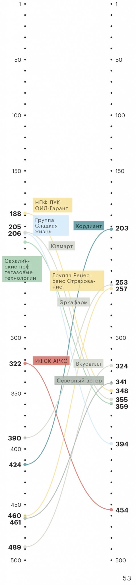 Лидером движения вверх стал производитель шин «Кордиант» (плюс 221 позиция). Занявшая второе место группа «Ренессанс Страхование» тоже переместилась более чем на 200 пунктов вверх. Также надо отметить значительное перемещение прошлогоднего новичка — торговой сети «Вкусвилл».