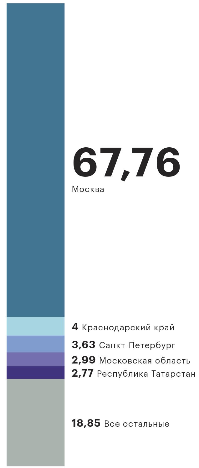 Согласно номерам ИНН основных компаний, групп с российской регистрацией (головных компаний и компаний с наибольшей выручкой), 49% компаний зарегистрированы как налогоплательщики в Москве. На налогоплательщиков Санкт-Петербурга, находящихся на втором месте этого списка, приходится уже только 6,6% компаний.