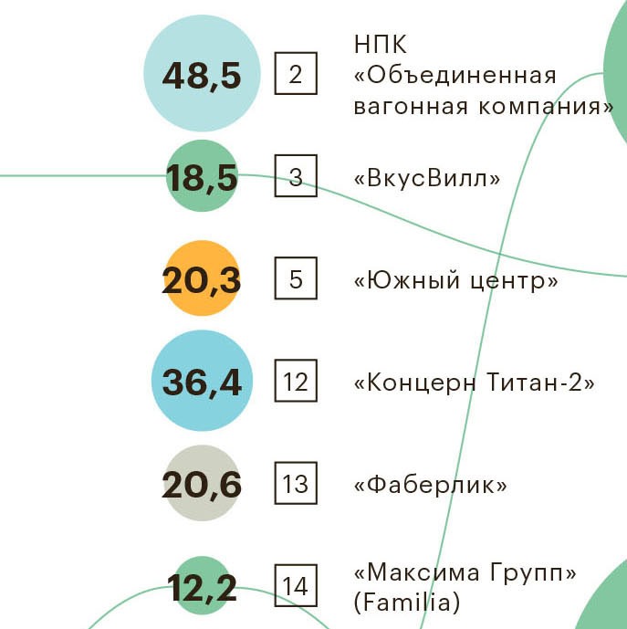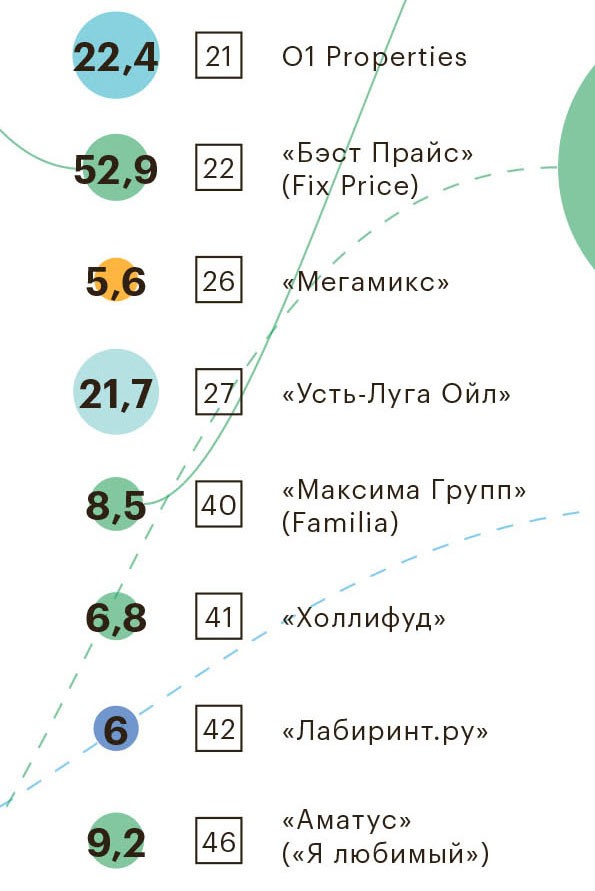 По линиям можно отследить изменения, происходившие в компаниях, которые появлялись в рейтинге три и более раз. Пунктирная линия означает, что компания на год выпадала из рейтинга