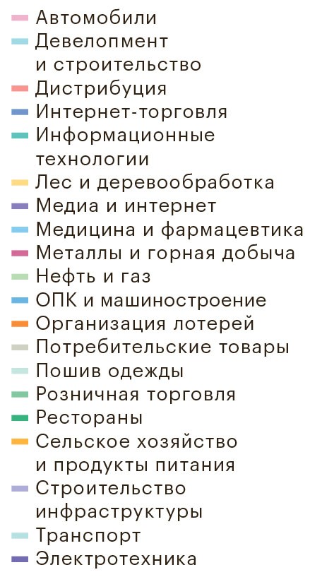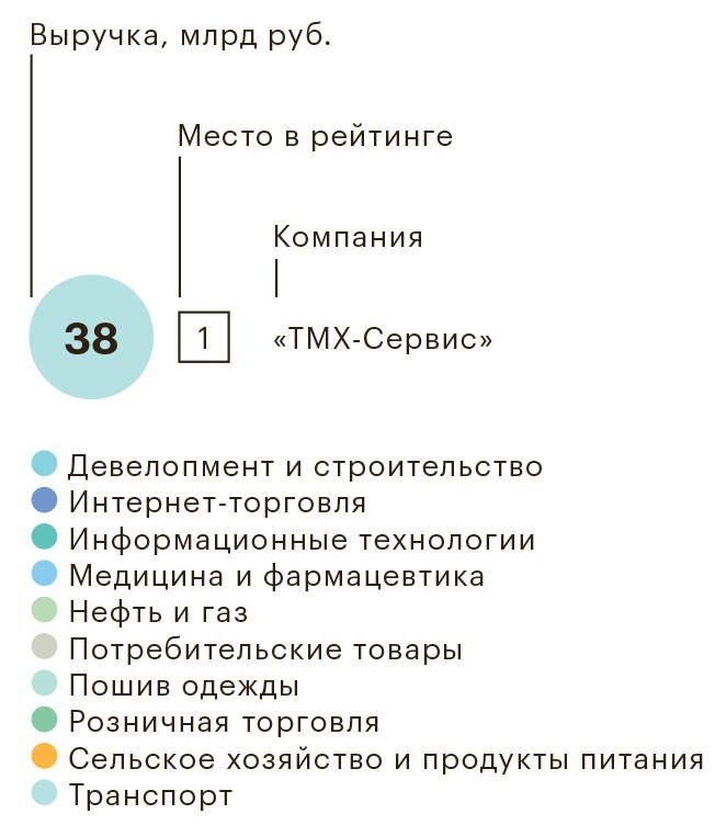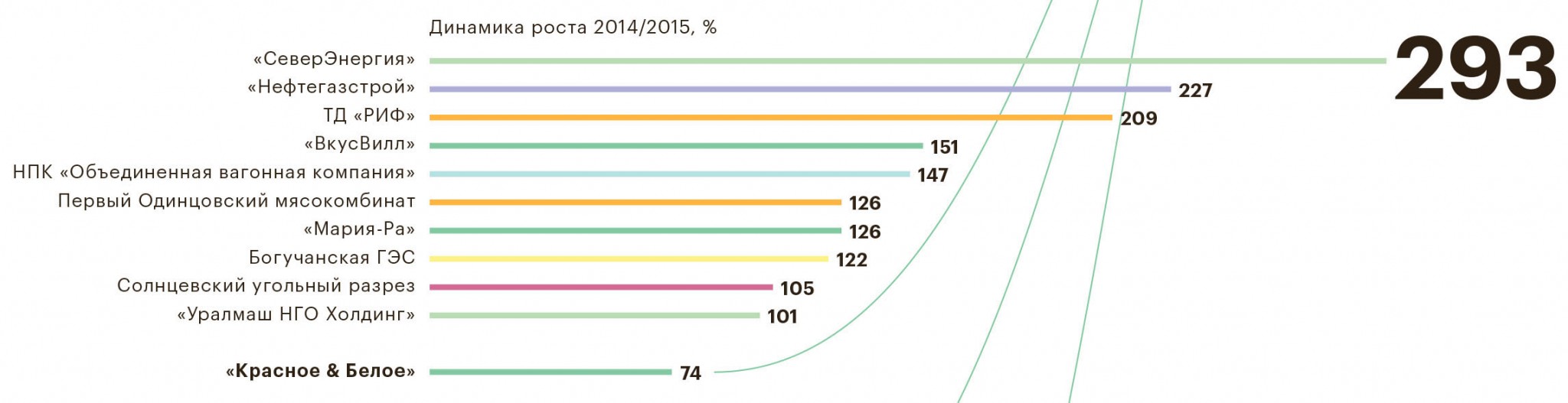 Абсолютный лидер всех рейтингов быстрорастущих компаний журнала РБК среди отраслей — розничная торговля. Представители этой отрасли лидировали в каждом рейтинге по числу представителей отрасли и почти всегда — по совокупной выручке. Последнее объясняется еще и тем, что в рейтинги попадают лидеры этой отрасли, огромные компании вроде «Ленты» или X5 Retail Group, лидеры других отраслей не растут так быстро. Лишь однажды, в 2016 году, лидером по совокупной выручке компаний отрасли стал сектор «нефть и газ», и то благодаря всего двум компаниям — «Северэнергии» (позже стала частью «Арктикгаза») и Антипинскому НПЗ (вошел в «Новый поток»). Примечательно, что розничная торговля никогда не была лидером по темпам роста среди других отраслей рейтинга, и ни один представитель ретейла не занимал первую строчку рейтингов (хотя сеть «Красное & Белое» остается единственной компанией, которая была в списке быстрорастущих пять раз подряд, увеличив за это время выручку более чем в семь раз). В этом смысле лучшие показатели у отрасли «транспорт», которая не опускается ниже второй строчки по темпам роста его представителей в рейтингах последних лет. Количество транспортных компаний в рейтингах все время растет: если в 2015 году их было три, то в 2018-м уже семь. Представители отрасли «транспорт» в 2018 году показали самый высокий темп роста за три предыдущих года.