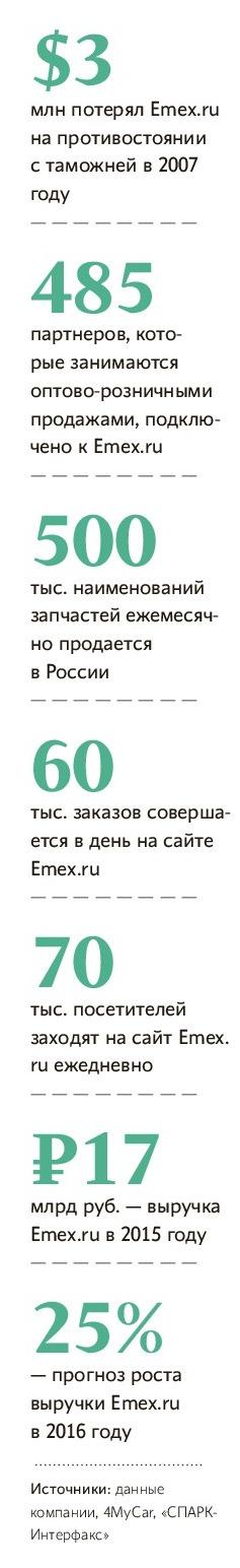 Emex.ru входит в тройку крупнейших по количеству заказов онлайн-магазинов запчастей (на первом месте Exist.ru, на третьем — Autodoc.ru), приводит данные партнер агентств Data Insight Борис Овчинников. Точное количество заказов эксперт называть не берется — за счет большой доли оптовых покупок эти оценки для Emex. ru расходятся «в разы». Рынок онлайн-торговли автозапчастями в России в 2015 году Data Insight оценивает в 35 млрд руб., но Овчинников уточняет, что эта сумма включает только розничные покупки. Весь рынок автозапчастей в стране, по данным агентства «Автостат», в 2015-м вырос по сравнению с 2014-м почти на 30%, до 1,16 трлн руб.