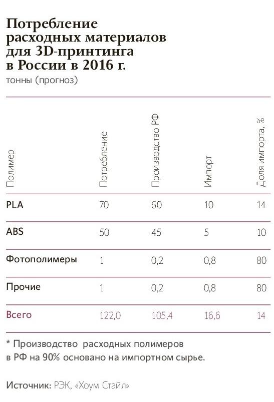 Исходя из фактического потребления полимеров для основных технологий 3D-печати, применяемых сегодня в России (70 т PLA, 50 т ABS, 1 т фотополимеров и 1 т остальных), емкость российского рынка необходимых полимеров в 2016 году можно ориентировочно оценить в 200 млн руб. Иными словами, сегодня наша доля мирового рынка расходников (полимеров) для 3D-принтинга составляет около 3%.