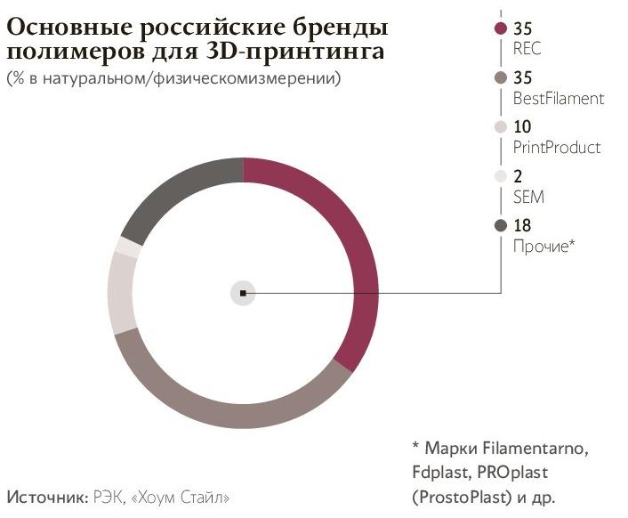 Средняя цена фотополимера европейского качества — около 10 тыс. руб. за литр, а ABS и PLA — 1,5 тыс. руб. за килограмм. Поставщики из Китая готовы предложить «лучшее качество за те же деньги», но если их цены на 30–50% ниже, то высока вероятность дефектов в напечатанных изделиях (например, в ABS подмешивают 10–50% вторсырья с включениями пыли). Среди отечественных производителей расходных материалов для 3D-печати лидерами являются компании РЭК (Москва), которая производит пластик под маркой REC, «Хоум Стайл» (Томск), выпускающая пластик под маркой BestFilament, и «Принт Продакт» (Санкт-Петербург) с маркой PrintProduct.