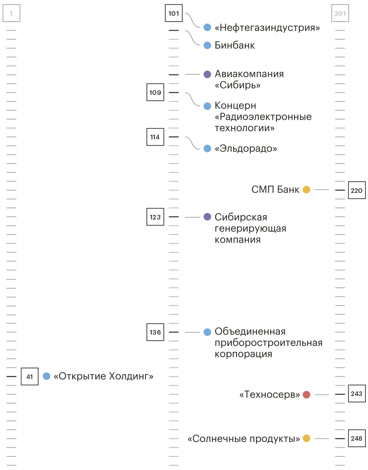 По семь компаний ушли из секторов «ОПК и машиностроение», «Сельское хозяйство и продукты питания», «Строительство инфраструктуры» и «Торговля». «Электроэнергетика» наряду с «Нефтью и газом» потеряли по шесть компаний. На четыре компании сократились списки «Транспорта» и «Фармацевтики».
