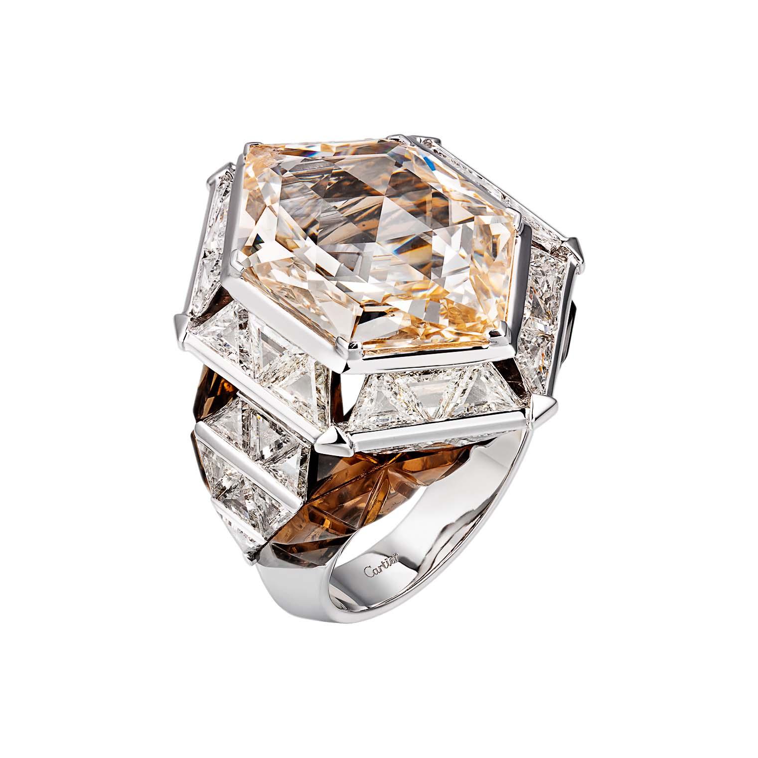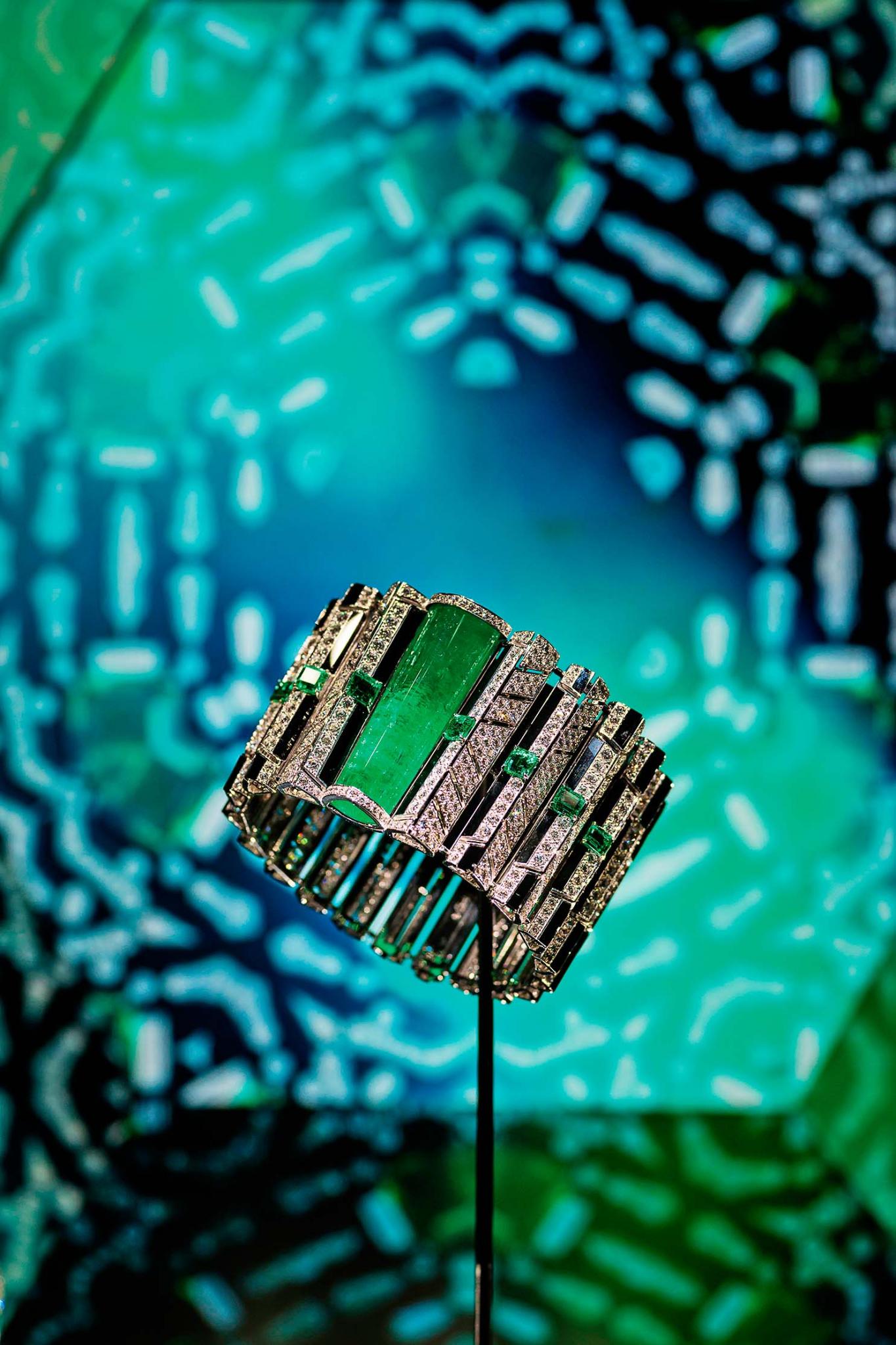 Заглавную роль в браслете Cinetique играет огромный полированный изумруд весом 40,68 карата, ограненный в виде призмы. В кольце Psyche светло-коричневый бриллиант весом более 8 каратов предстал в форме правильного шестигранника, окруженного бесцветными бриллиантами и дымчатыми кварцами треугольной огранки. Сплетение объемных треугольников образует сияющее колье Luminance из белого золота. Кроме бриллиантов треугольной огранки в нем использованы бриллианты огранки «роза» треугольной формы, причем камни нередко имеют двойную оправу. Не забыли ювелиры Cartier и свой фирменный стиль tutti frutti, появившийся еще в 1920-х: десяток украшений (серьги, браслеты, колье) исполнены из изумрудных, рубиновых и сапфировых бусин, покрытых резьбой и гравировкой.