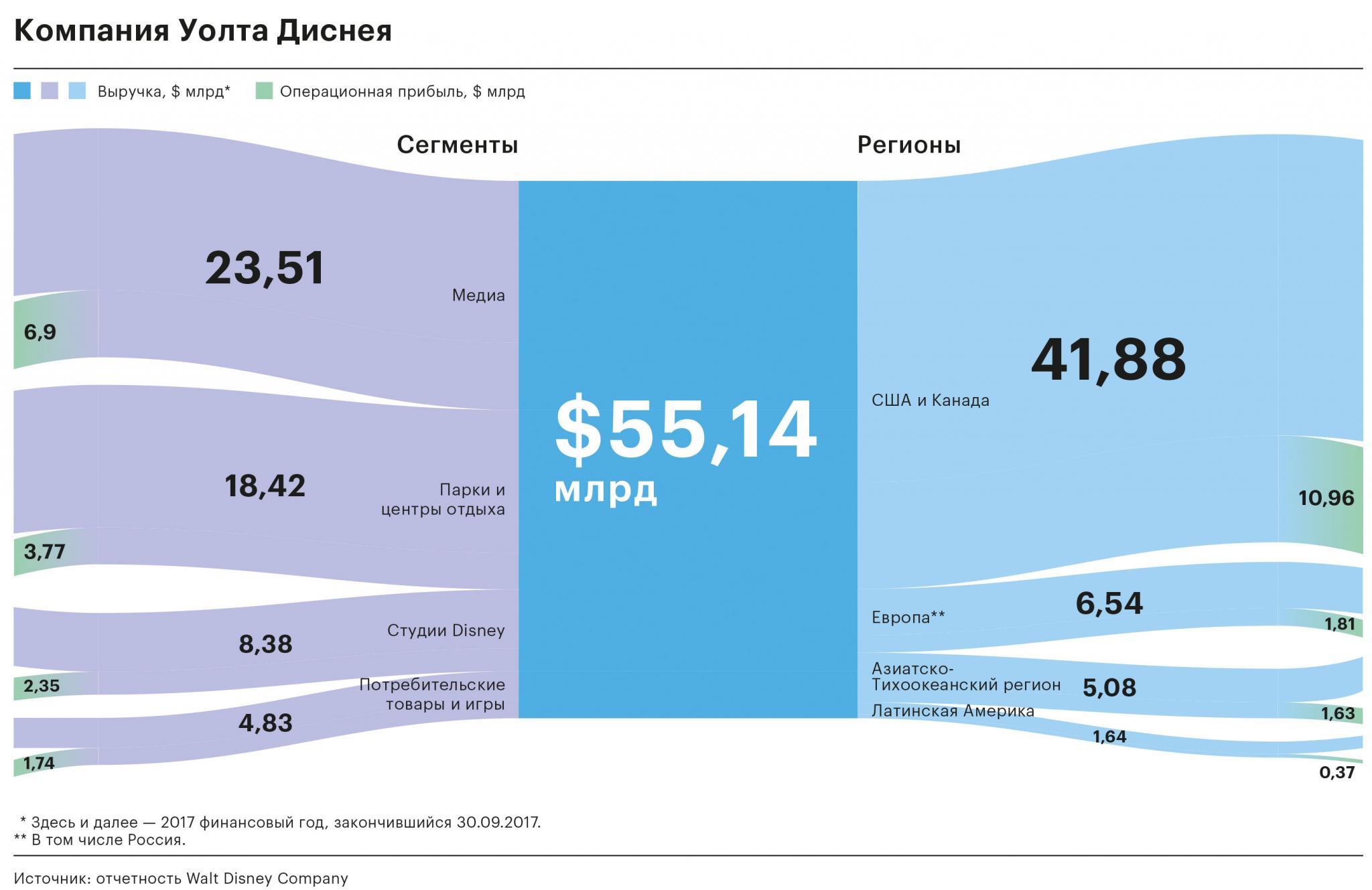 The Walt Disney Company — транснациональный конгломерат, но прежде всего это американская компания: 76% общей выручки, которая в 2017 финансовом году составила $55,1 млрд, ей принес рынок Северной Америки (см. инфографику на стр. 79). На этом фоне остальные рынки выглядят очень второстепенными, а Россию, показатели которой в отчетности компании находятся внутри региона «Европа», нельзя разглядеть вообще — финансовые данные российского офиса компания не раскрывает.