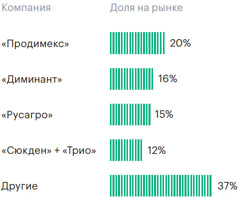 Серьезный вклад в развитие собственных мощностей обеспечили ведущие агрохолдинги, выстраивающие вертикально интегрированное производство сахара от поля до прилавка. По данным Национального рейтингового агентства (НРА), около 60% рынка сахара контролируется четырьмя производителями. Крупнейшим из них с долей 19% является группа компаний «Продимекс».