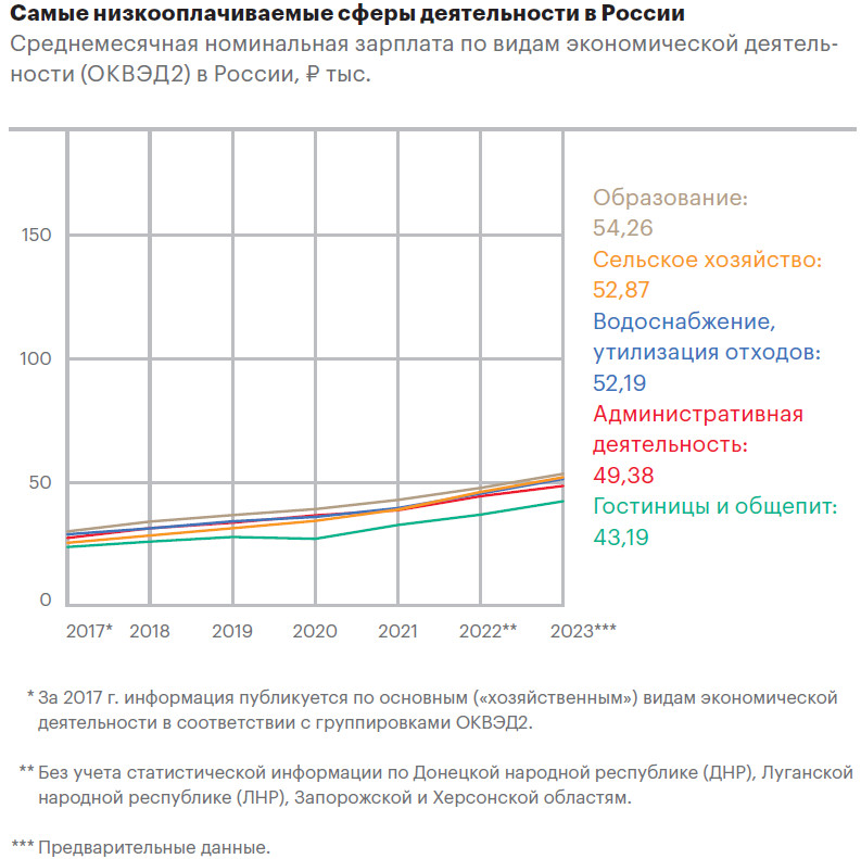 Впрочем, у проблемы неравенства в России есть свои особенности. С одной стороны, стоит говорить об исторической распространенности низких зарплат, которые остаются главным источником дохода для большинства россиян. Например, средняя зарплата в аграрном секторе почти в два раза ниже, чем в среднем по стране. В целом зарплата низкооплачиваемых и высокооплачиваемых работников в сфере финансов, торговли и общественного питания отличается в 25 раз.